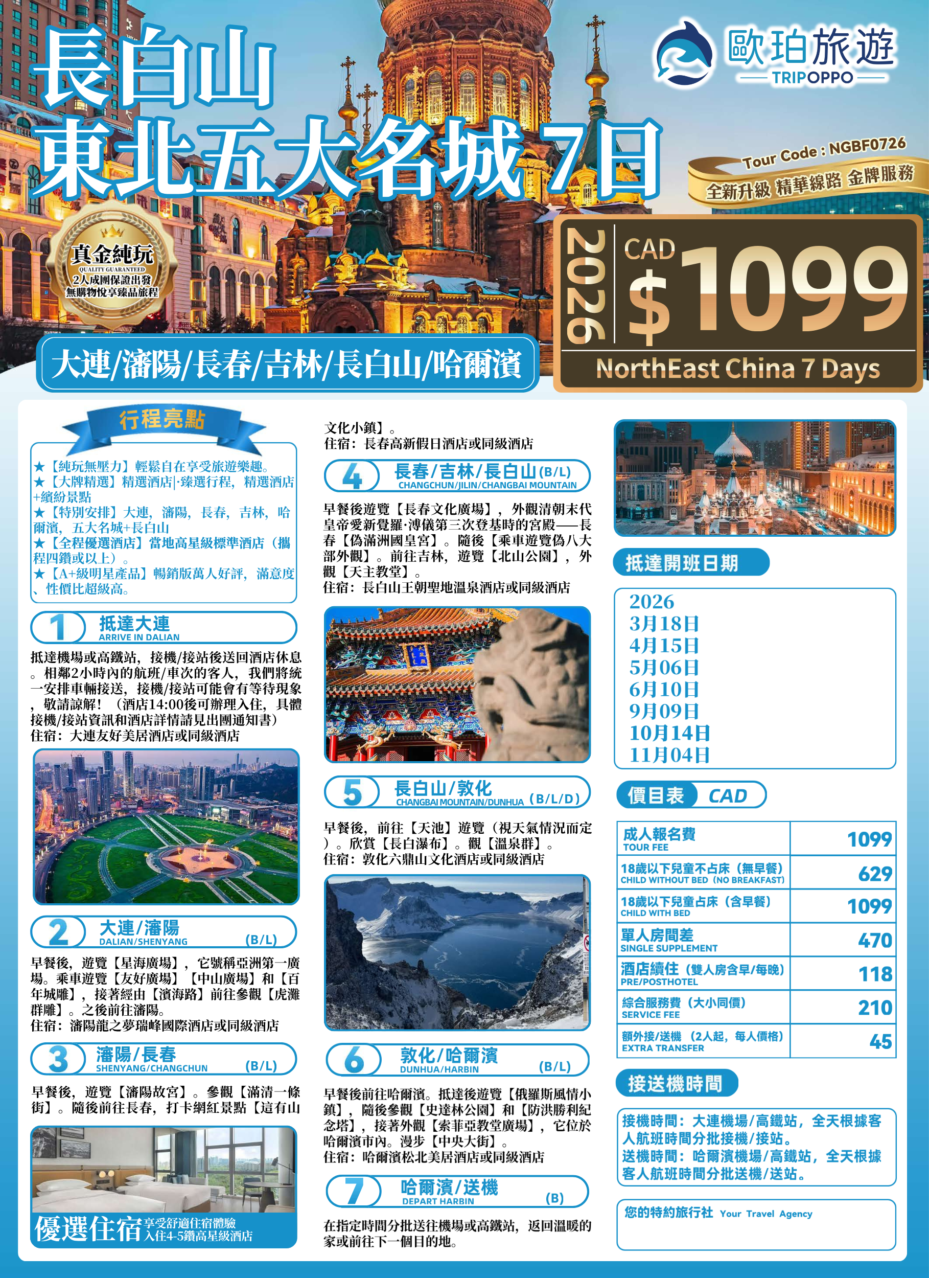 ★【特別安排】大連,瀋陽,長春,吉林,哈爾濱,五大名城+長白山