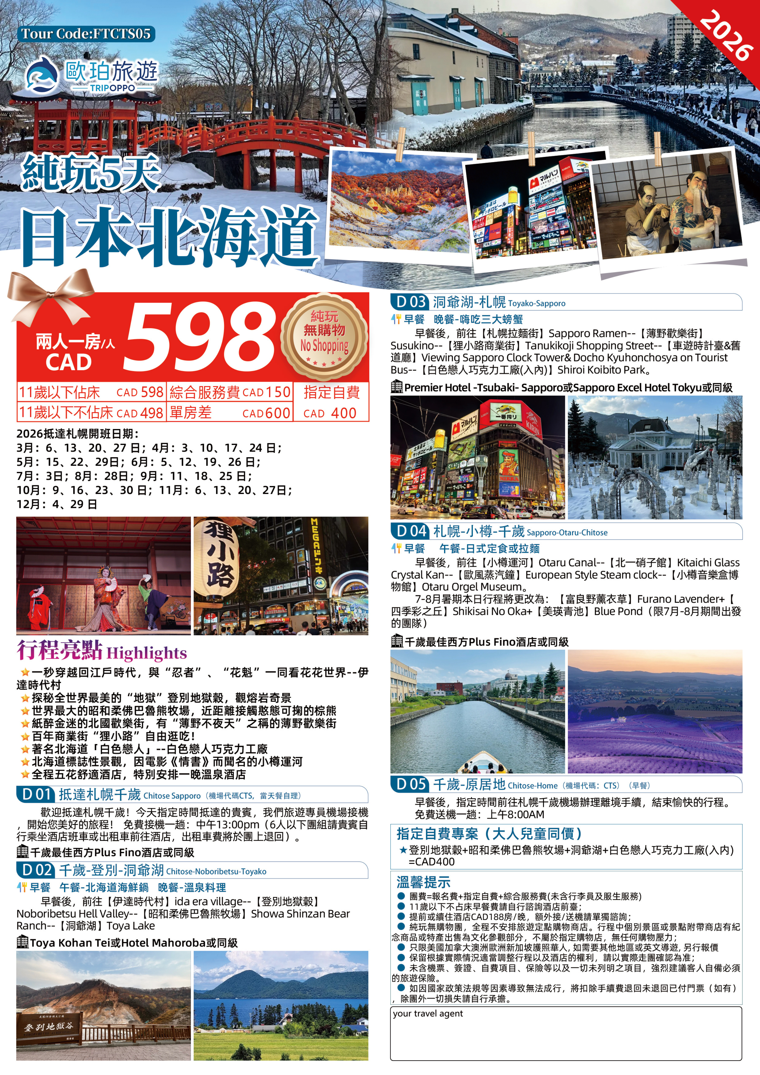 登別地獄穀+昭和柔佛巴魯熊牧場+洞爺湖+白色戀人巧克力工廠(入内)=USD290/CAD400/AUD460