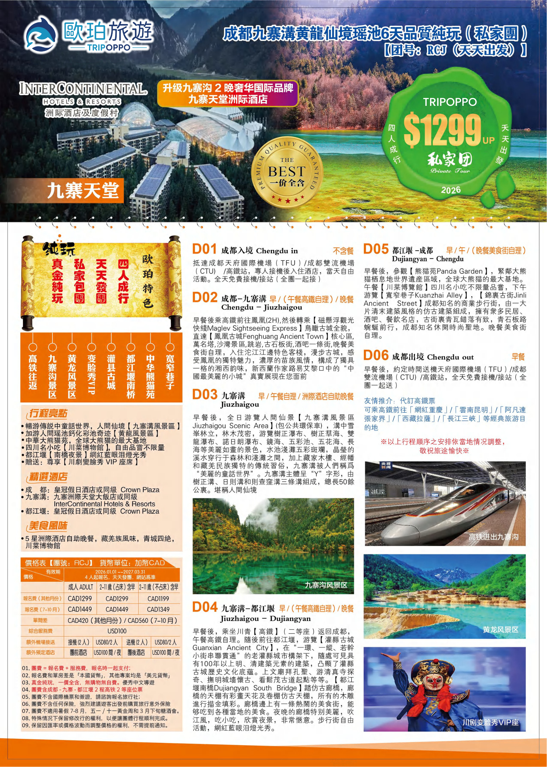 四人成行,天天出發 私家包團,私享服務,不與陌生人拼團遊 真金純玩,無購物無自費【一價全含】 升級:舒適快捷【成都-九寨溝往返高鐵】 升級:九寨溝2晚奢華國際品牌「洲際酒店」 2晚InterContinental Hotels & Resorts 加遊:人間瑤池,鈣化彩池奇跡【黃龍風景區】 贈送:尊享【川劇變臉秀VIP座席】