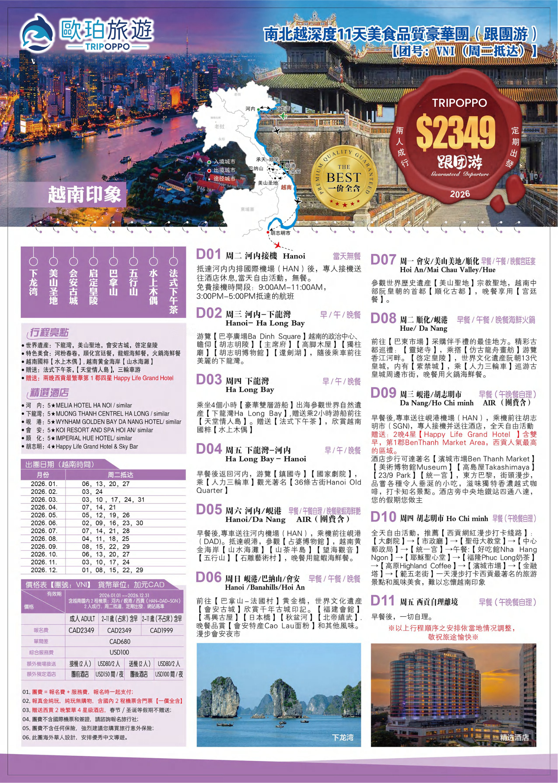 兩人成行,週二抵達,定期出發; 真金純玩,純玩無購物【一價全含】 豪華5星酒店配套,含國內2程機票 特色美食:河粉春捲,順化宮廷餐,龍蝦海鮮餐,火鍋海鮮餐 贈送:法式下午茶,【天堂情人島】,三輪車遊 贈送:兩晚西貢最繁華第1郡四星Happy Life Grand Hotel