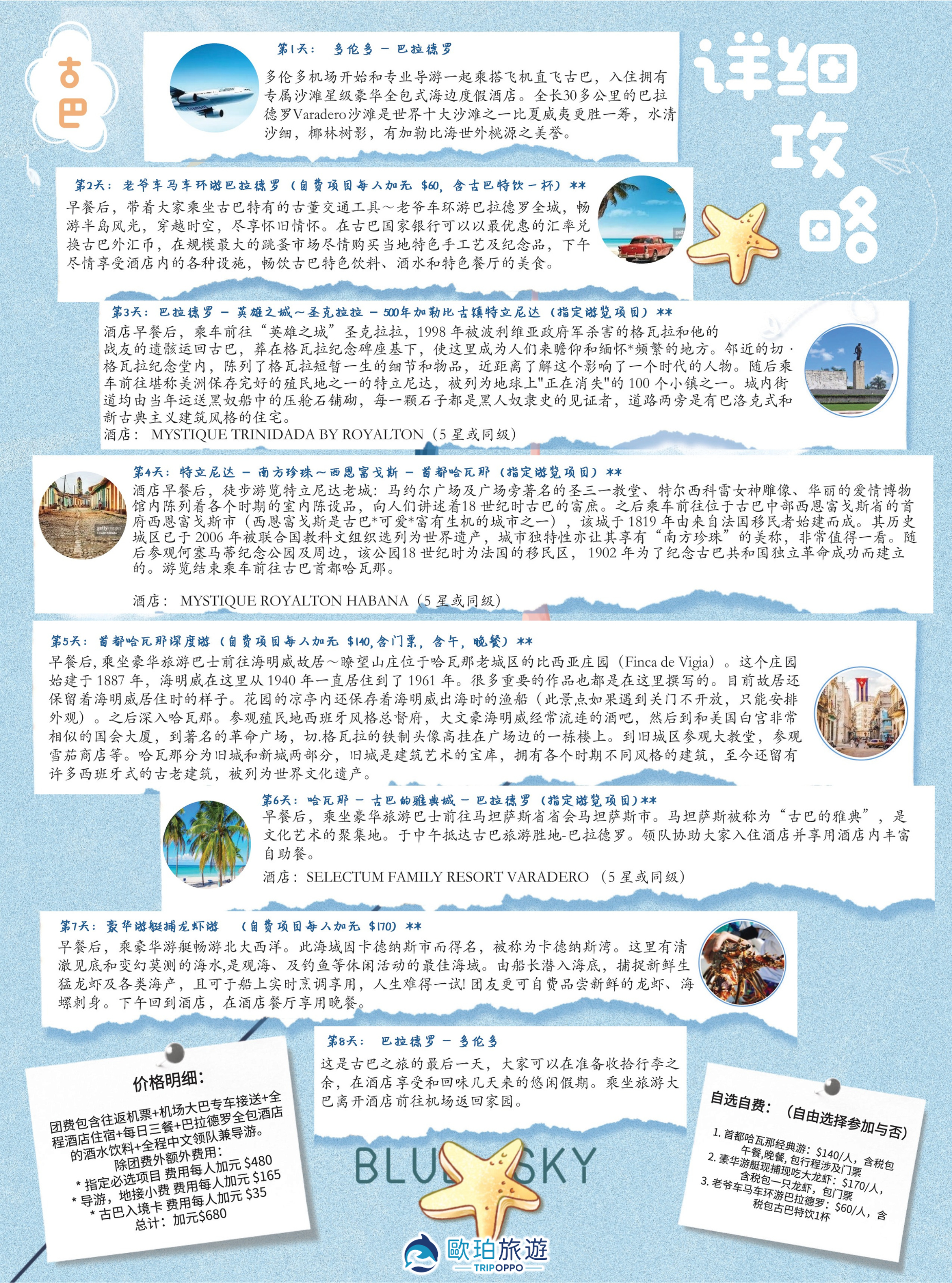 最終價格 = 團費 + 指定遊覽費用($480) + 導遊,地接小費($165) + 古巴入境卡($35) + 自選遊覽項目