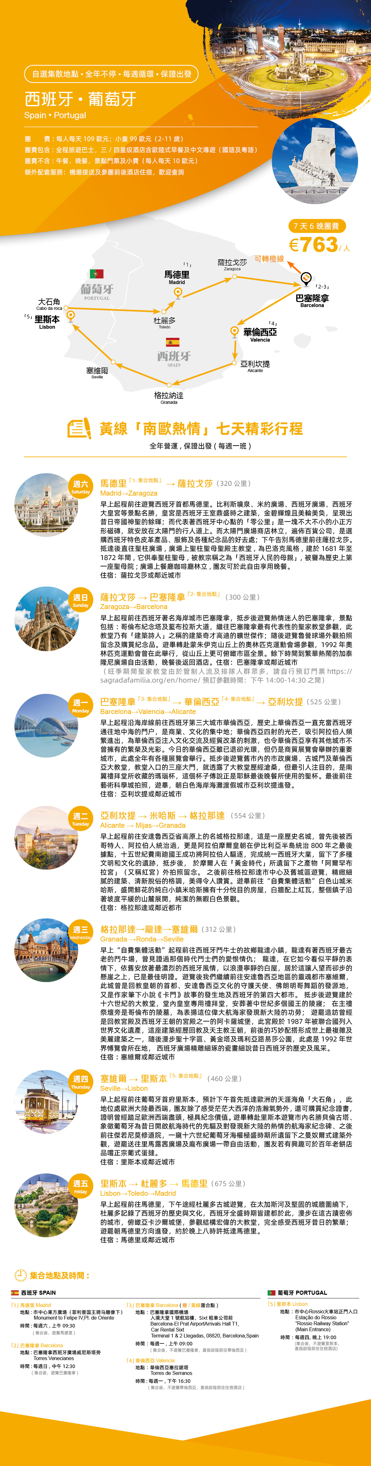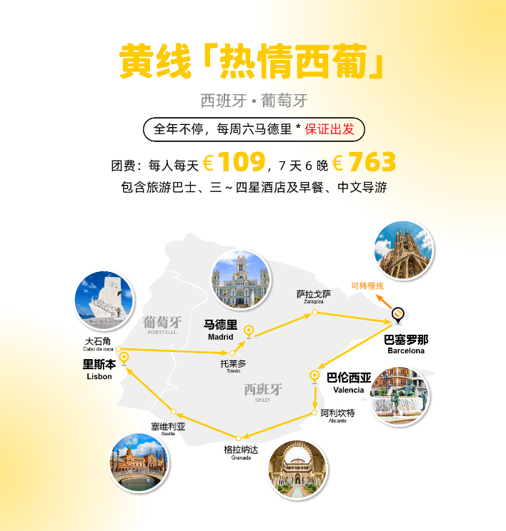 Tips:黄线可提供免费及付费接送机和参团前后酒店的城市:马德里、巴塞罗拿、里斯本*(*注意:里斯本无法提供团前酒店)(免费