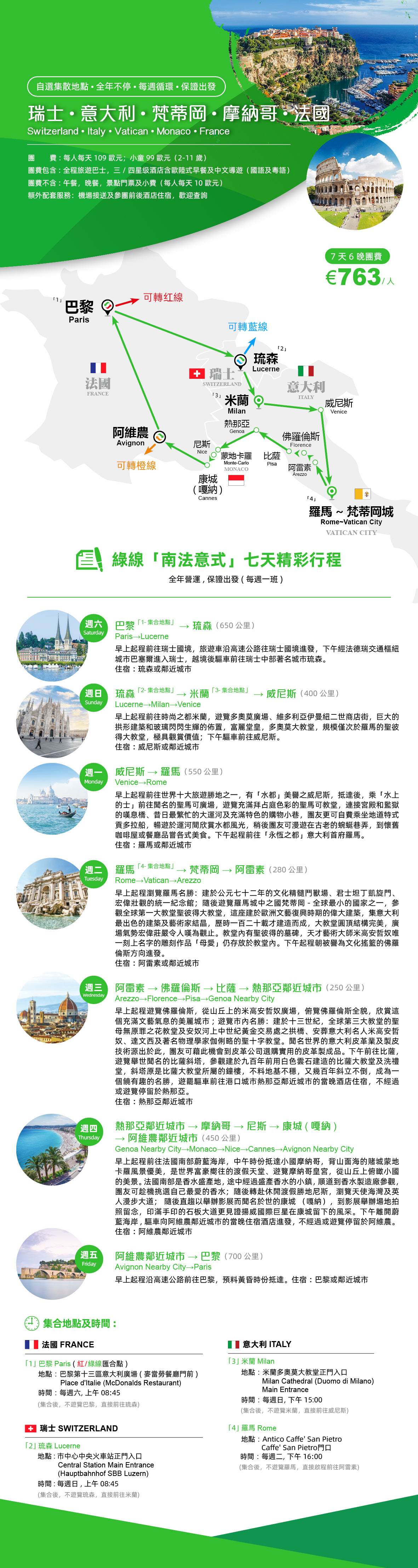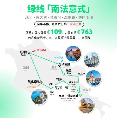 Tips:绿线可提供免费及付费接送机和参团前后酒店的城市:巴黎、罗马。免费接送机只在指定时间及地点提供。