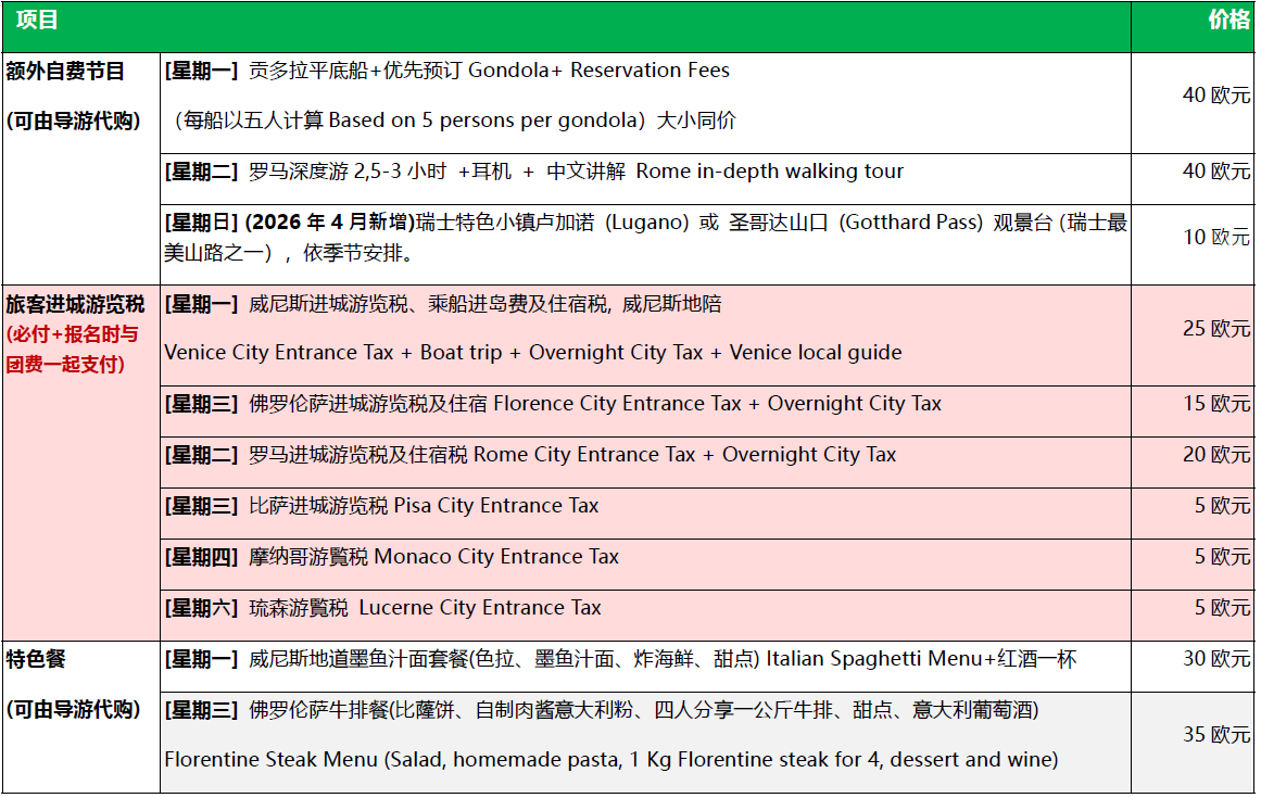 【说明】团友可按个人喜好,决定是否参加用餐、景点或自费节目,绝非强迫规定,但每人每天必须支付给导游及司机小费共10 欧元。
