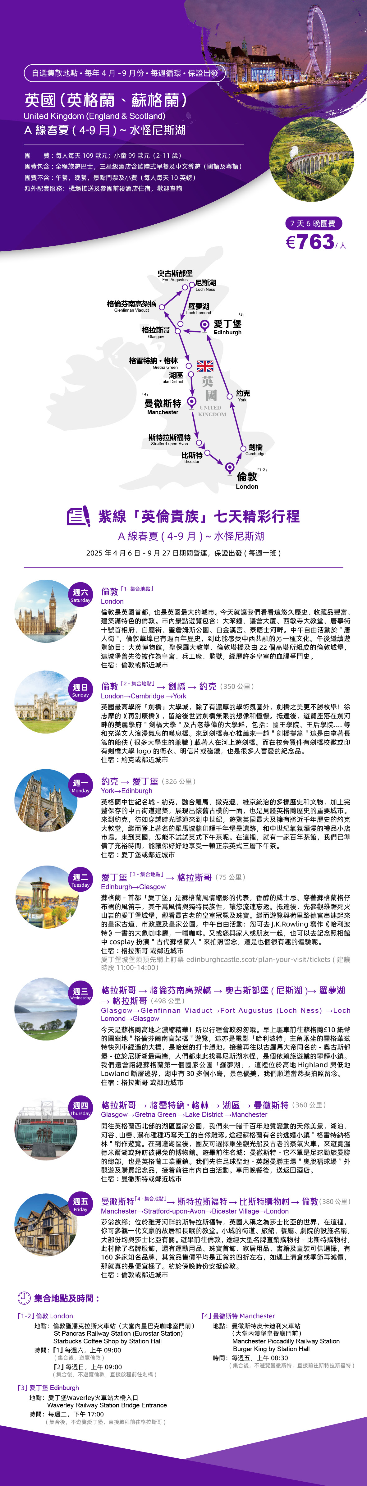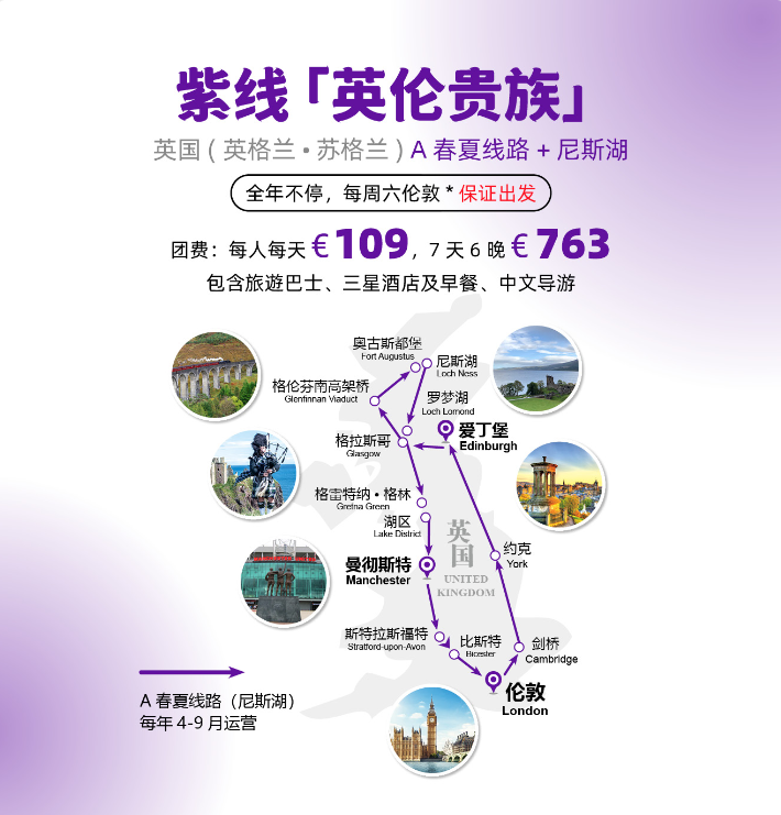 Tips:紫线可提供免费及付费接送机和参团前后酒店的城市:伦敦。曼彻斯特设有参团前后酒店,没有免费接送机,但有付费接送机服务。