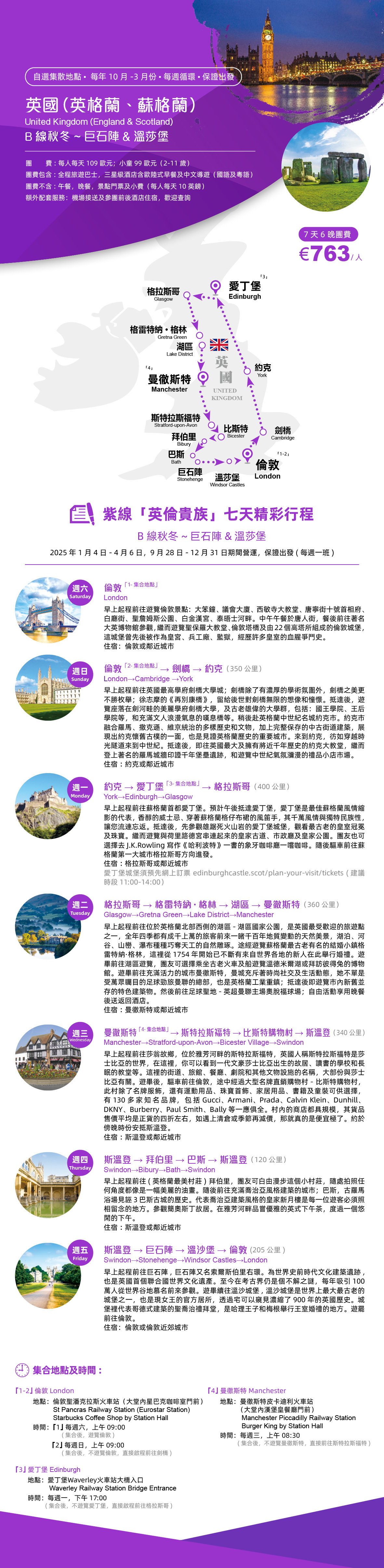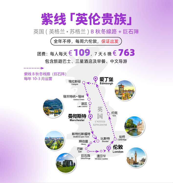 Tips:紫线可提供免费及付费接送机和参团前后酒店的城市:伦敦。曼彻斯特设有参团前后酒店,没有免费接送机,但有付费接送机。