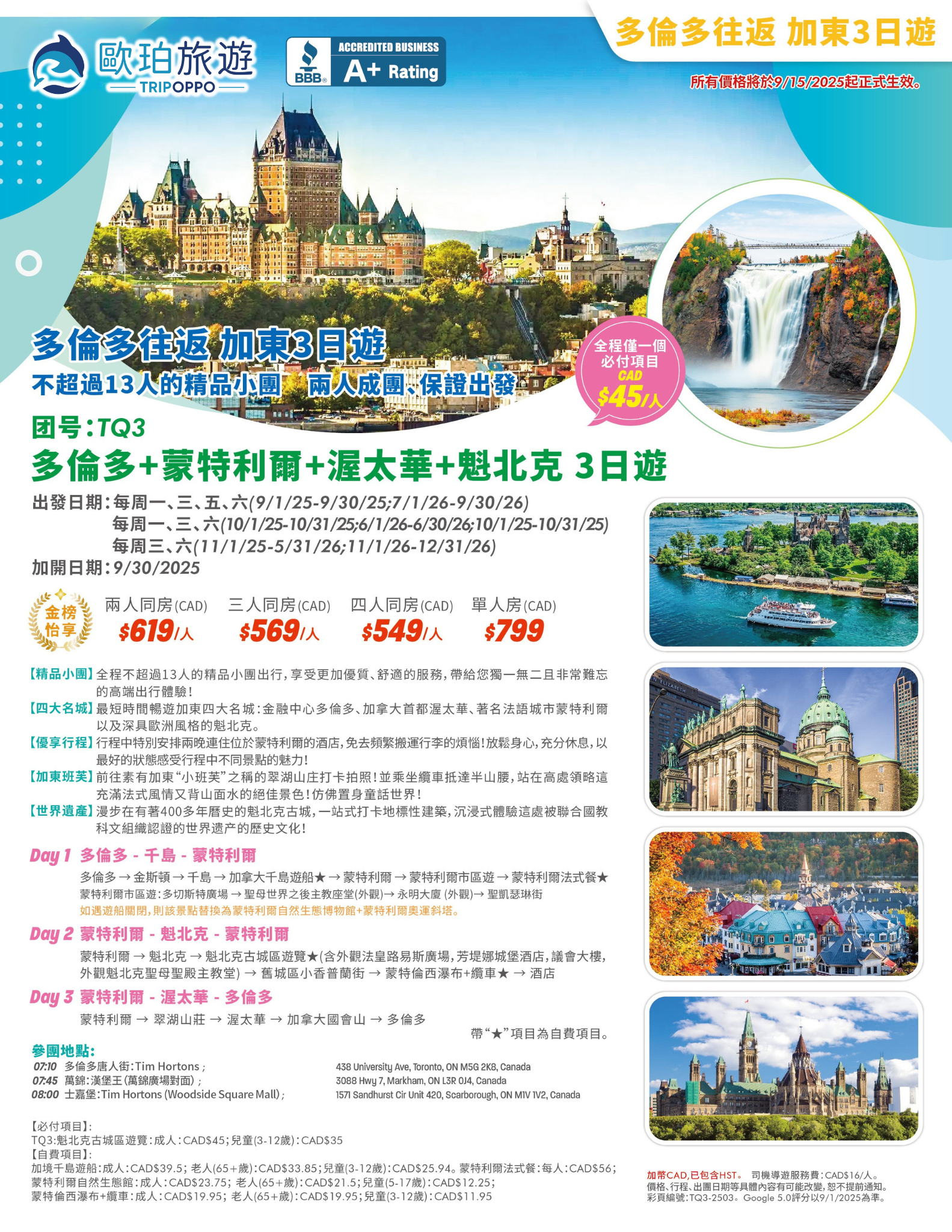 加拿大 多倫多+蒙特利爾+渥太華+魁北克 3日遊