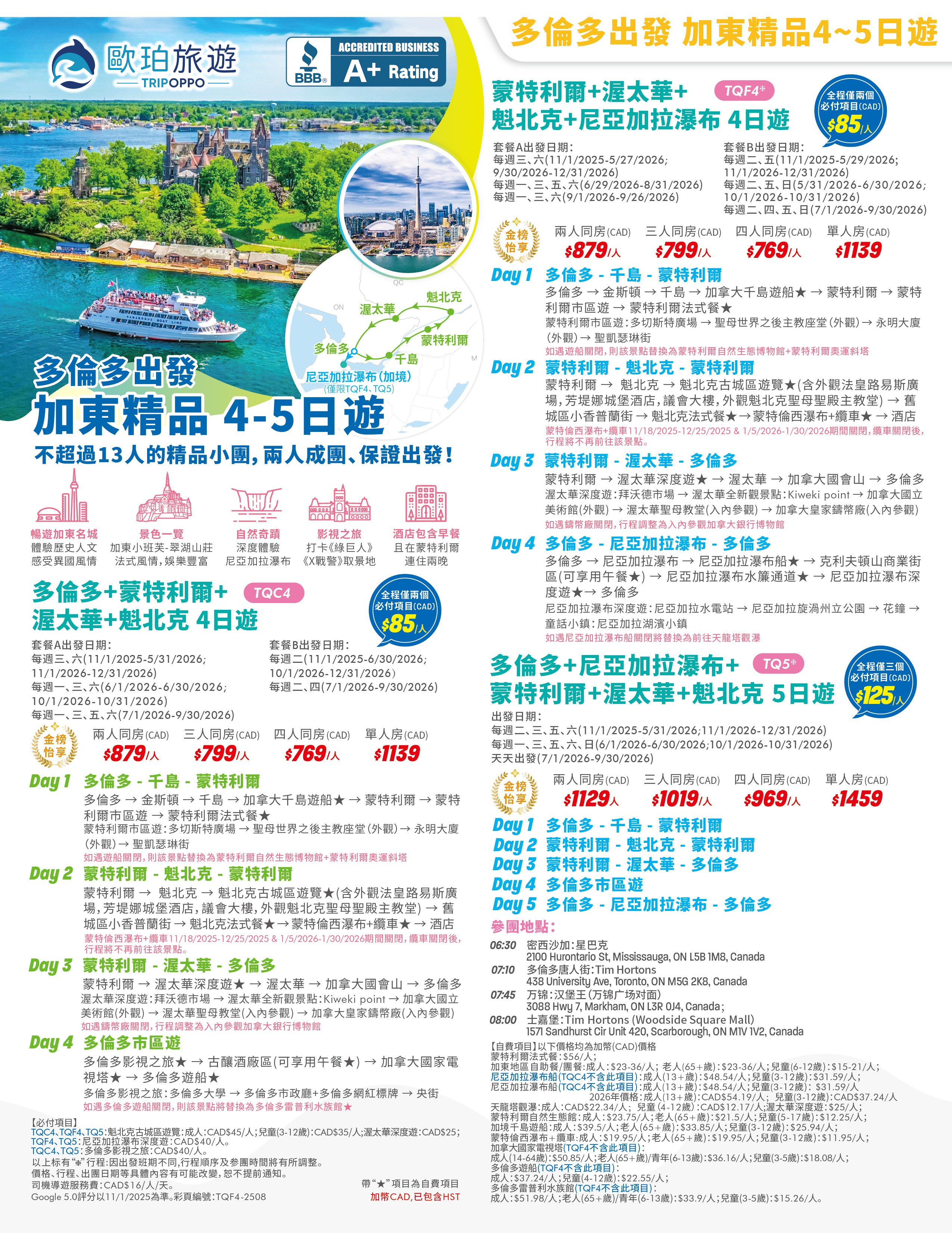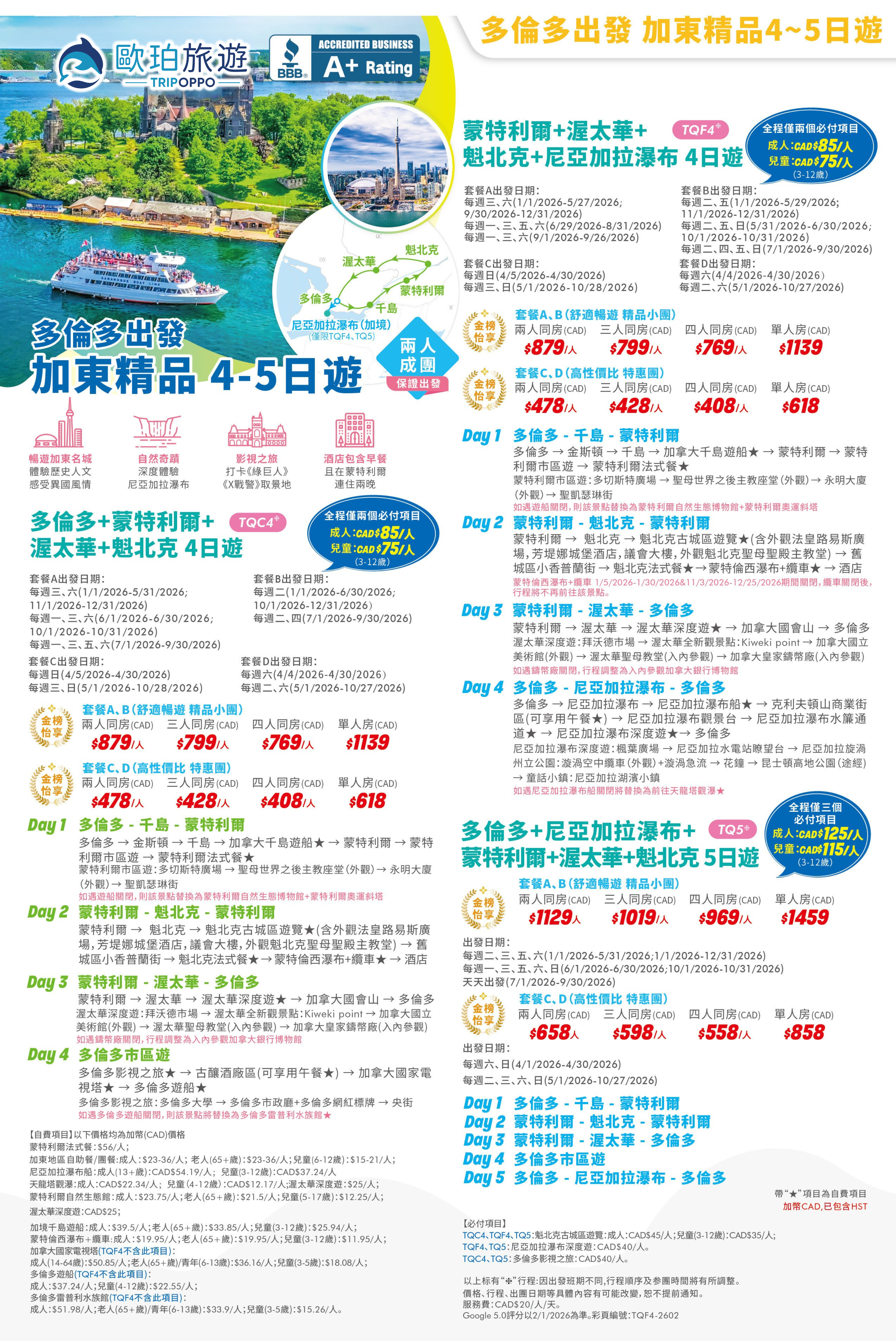 蒙特利爾+渥太華+魁北克+多倫多市區遊+尼亞加拉瀑布 5日遊TQ5 出發班期