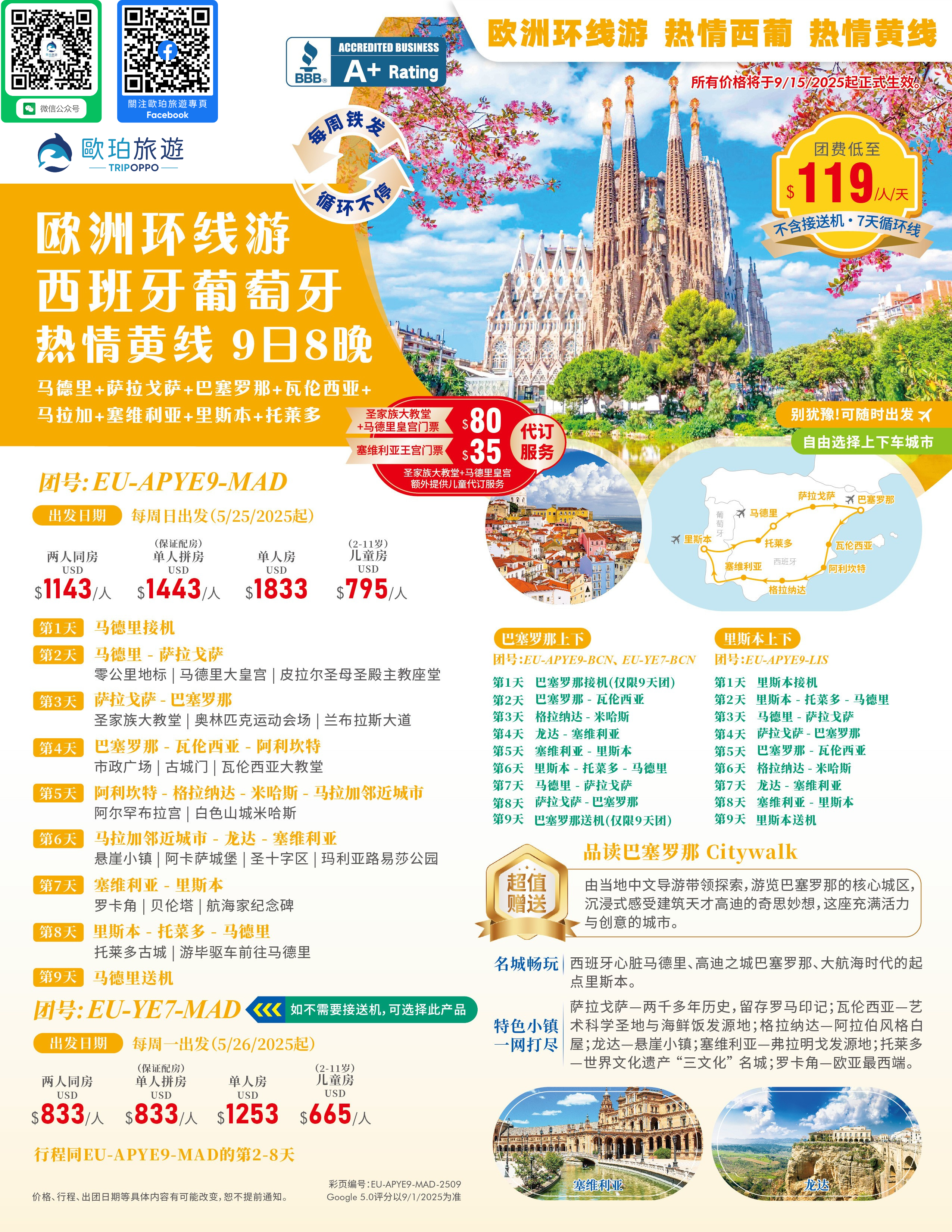 | 馬德里+薩拉戈薩+巴塞羅那+瓦倫西亞+馬拉加+塞維利亞+里斯本+托萊多 7~9天遊