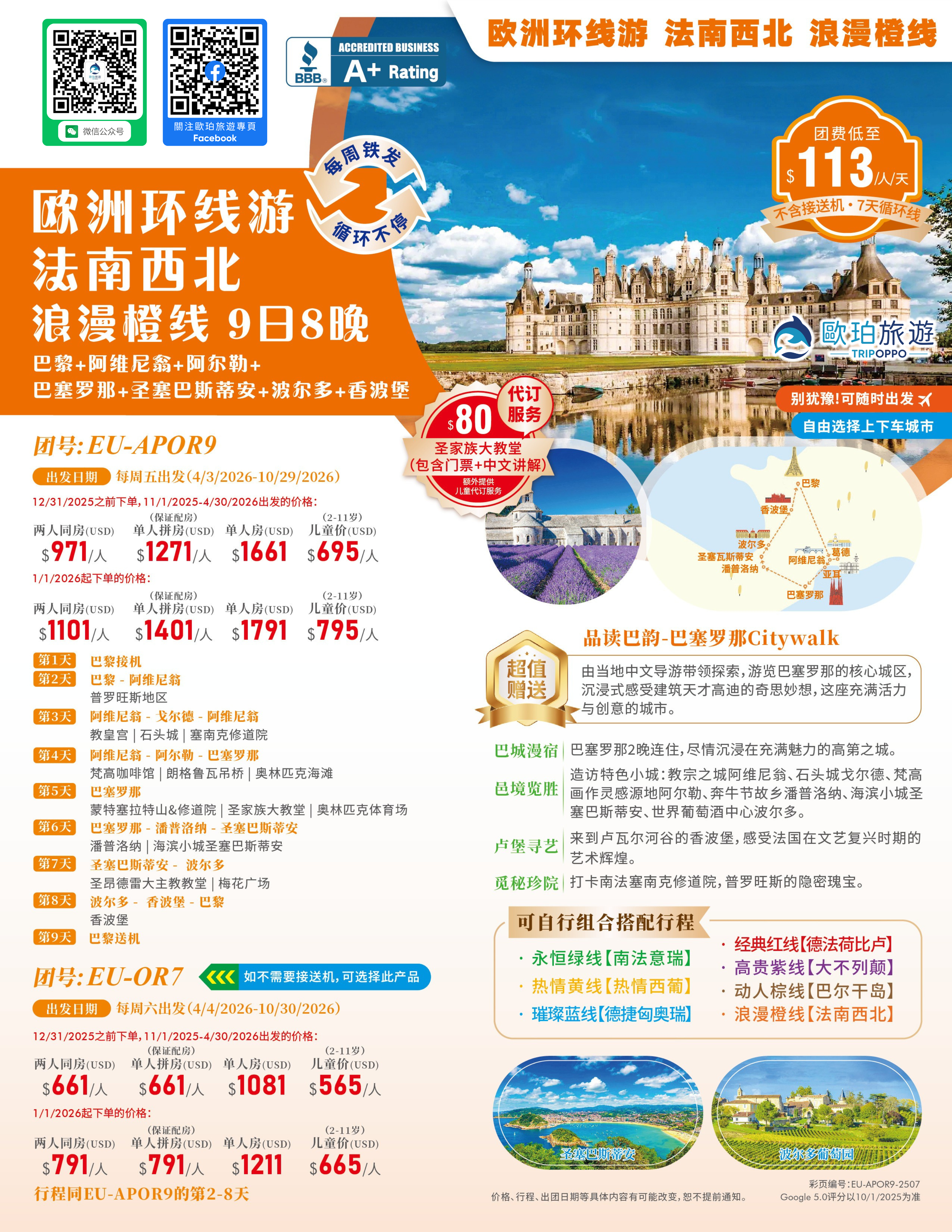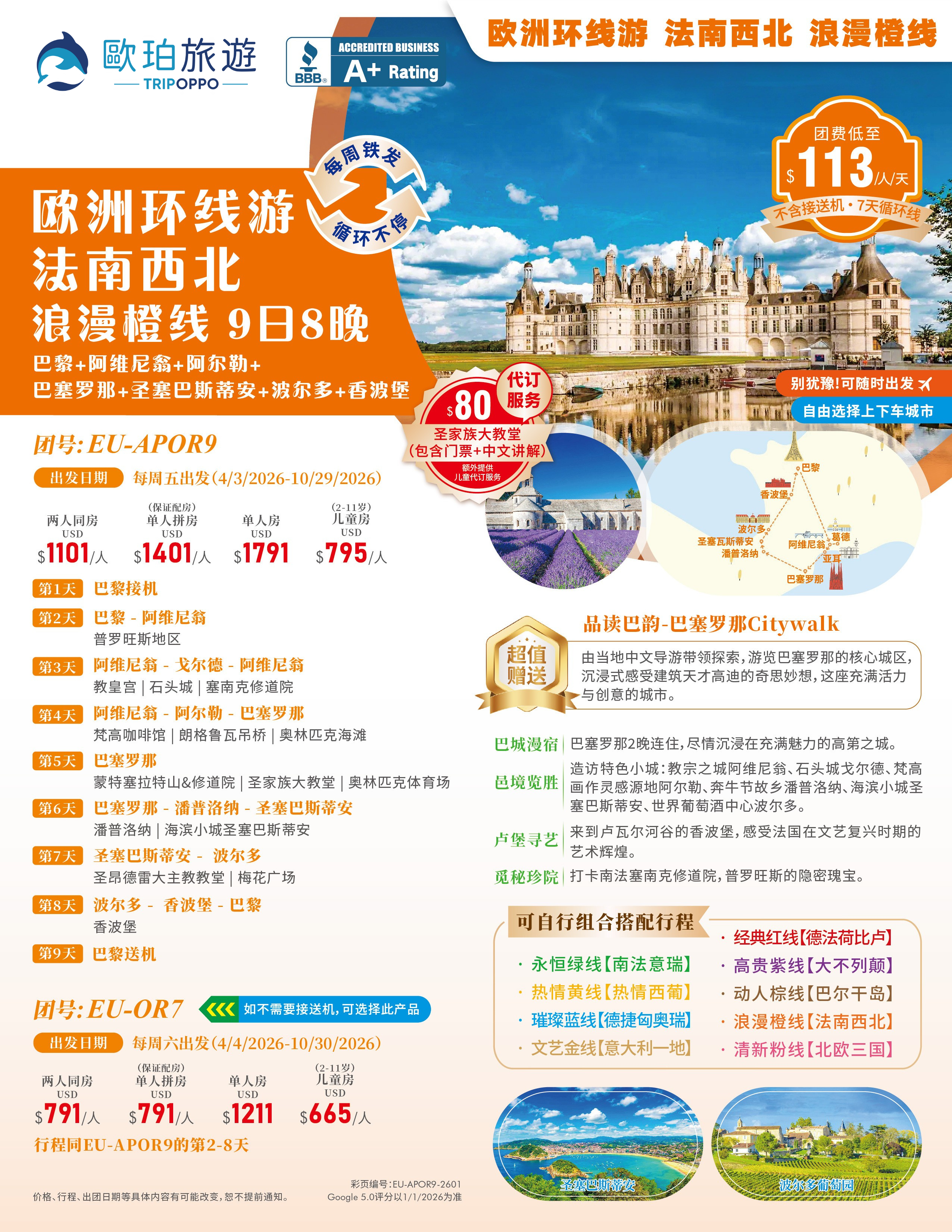【浪漫橙線】浪漫南法&熱情西班牙環線丨巴黎+阿維尼翁+阿爾勒+巴塞羅那+聖塞巴斯蒂安+波爾多+香波堡 7~9天遊