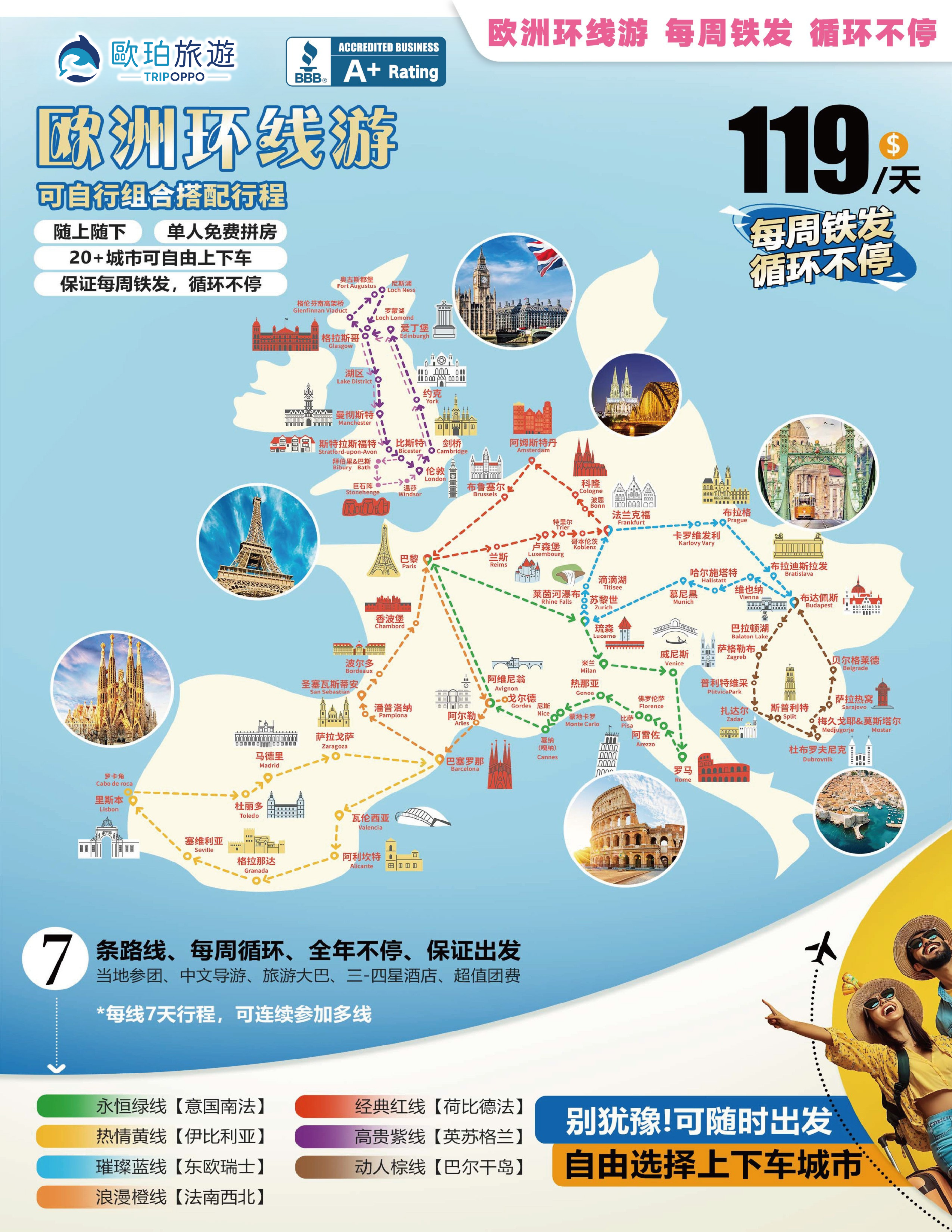 提供门票预定服务 中文导游接机服务 红、绿、蓝、黄、棕、橙,紫均可选择,每周出发,固定行程,固定的顺序全年循环不停 20多个城市自由上下车,任意搭配。 团费以“天”计算,每天团费固定且价格低至$119美元/天,玩几天算几天(最后1晚不含住宿) 每条循环线搭配了包含接送机和团前团后酒店的9天行程 所有环线每周发团,1人起订,提供拼房服务 所有环线团1位导游全程陪同,中、英文双语讲解