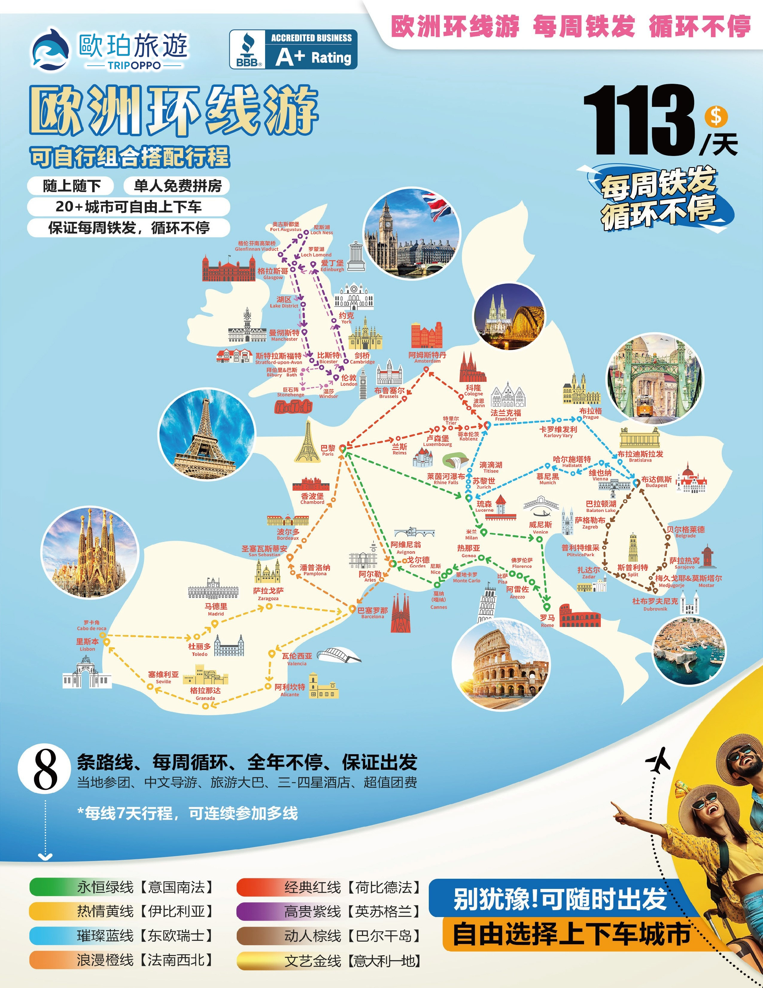 提供门票预定服务 中文导游接机服务 红、绿、蓝、黄、棕、橙,紫均可选择,每周出发,固定行程,固定的顺序全年循环不停 20多个城市自由上下车,任意搭配。 团费以“天”计算,每天团费固定且价格低至$113美元/天,玩几天算几天(最后1晚不含住宿) 每条循环线搭配了包含接送机和团前团后酒店的9天行程 所有环线每周发团,1人起订,提供拼房服务 所有环线团1位导游全程陪同,中、英文双语讲解