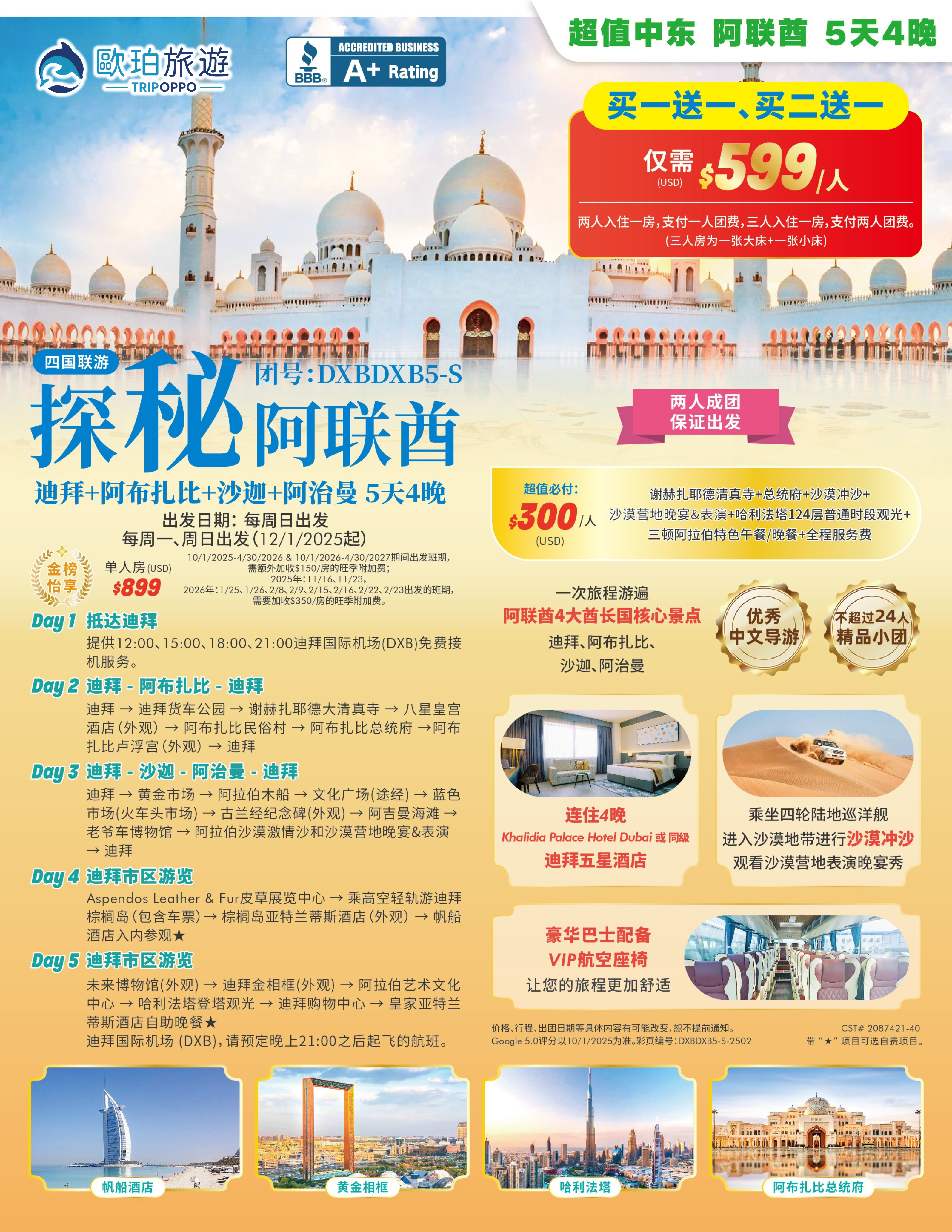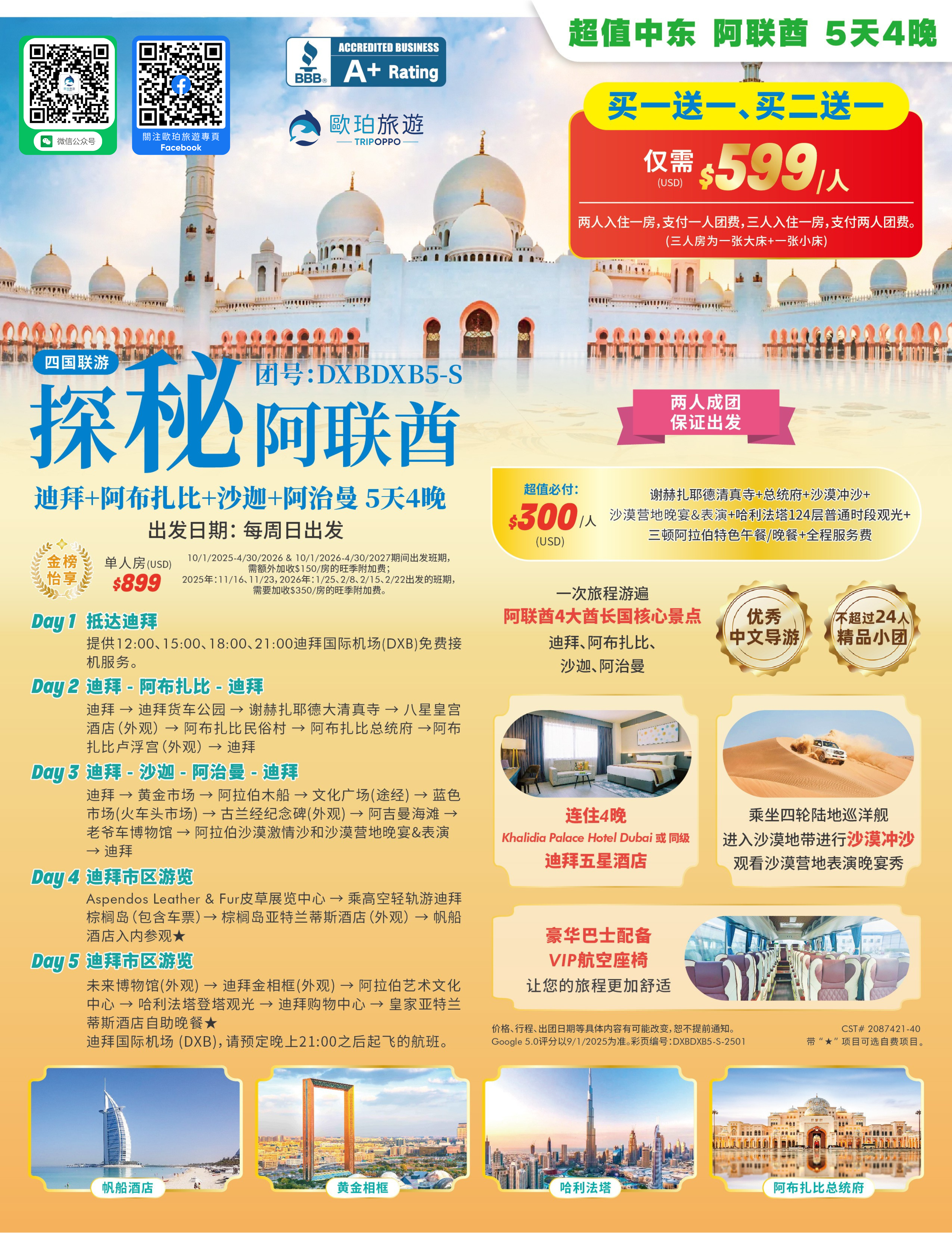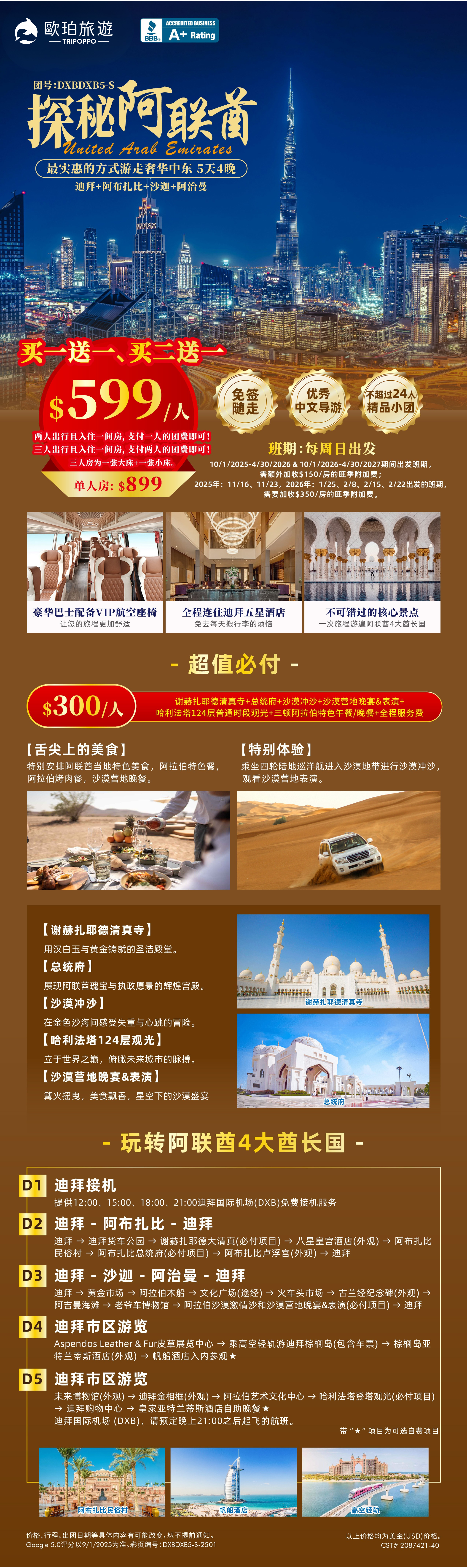 迪拜,这座融合现代奢华与独特文化的国际都市,以世界级的购物天堂、壮观的摩天大楼和便捷的签证政策,成为全球旅行者心中的梦幻目的地。年末将至,迪拜的异域风情与奢华购物,正是犒劳自己、放松身心的理想选择。现特别推出迪拜精品小团,一次旅程畅游阿联酋四大酋长国:迪拜、阿布扎比、沙迦、阿治曼核心景点。行程安排四轮陆地巡洋舰驰骋沙漠、体验冲沙快感,欣赏沙漠营地表演,品味阿联酋当地美食。全程两人成团,保证出发;不超过24人,优秀中文导游、豪华巴士配备VIP航空座椅;贴心安排连住四晚迪拜五星酒店,轻松舒适,无需每日搬运行李。