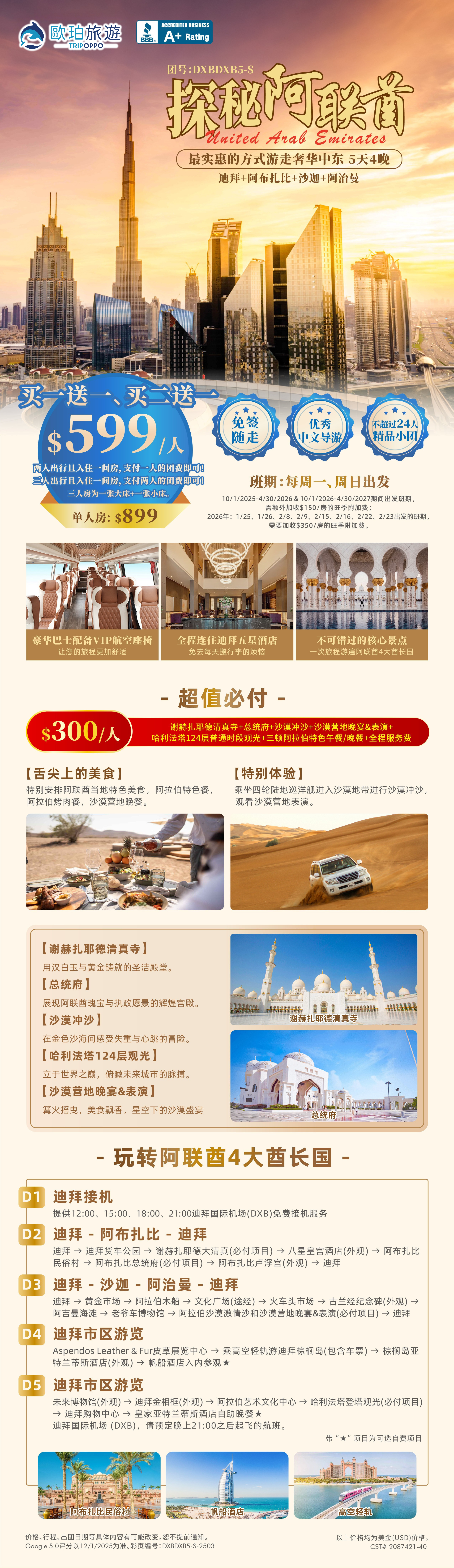每人$300美金的超值必付,内容包含:谢赫扎耶德清真寺、总统府、沙漠冲沙、沙漠营地晚宴及表演、哈利法塔124层普通时段观光、三顿阿拉伯特色正餐以及全程服务费。