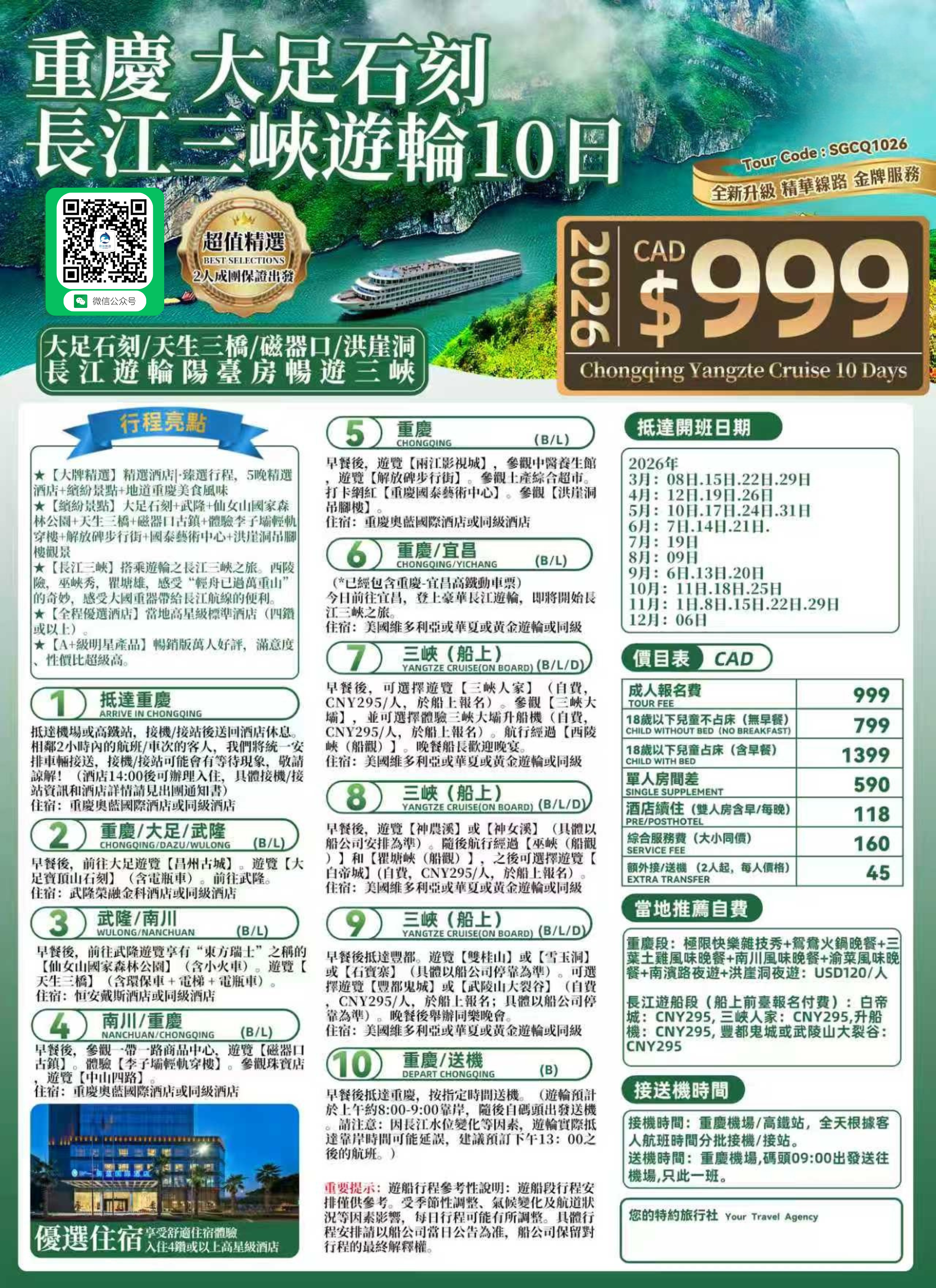 【繽紛景點】大足石刻+武隆+仙女山國家森林公園+天生三橋+磁器口古鎮+體驗李子壩輕軌穿樓+解放碑步行街+國泰藝術中心+洪崖洞吊腳樓觀景