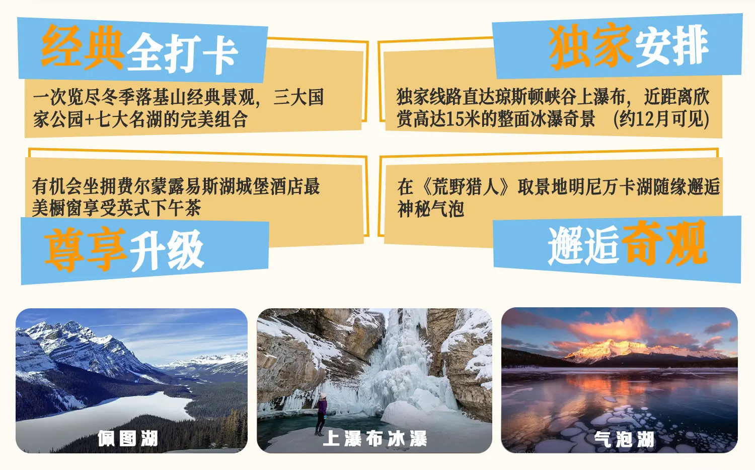 【冬季热卖】落基山班夫国家公园跟团游,2晚班夫镇+1晚卡尔加里,七大名湖+冰原大道+班夫缆车,