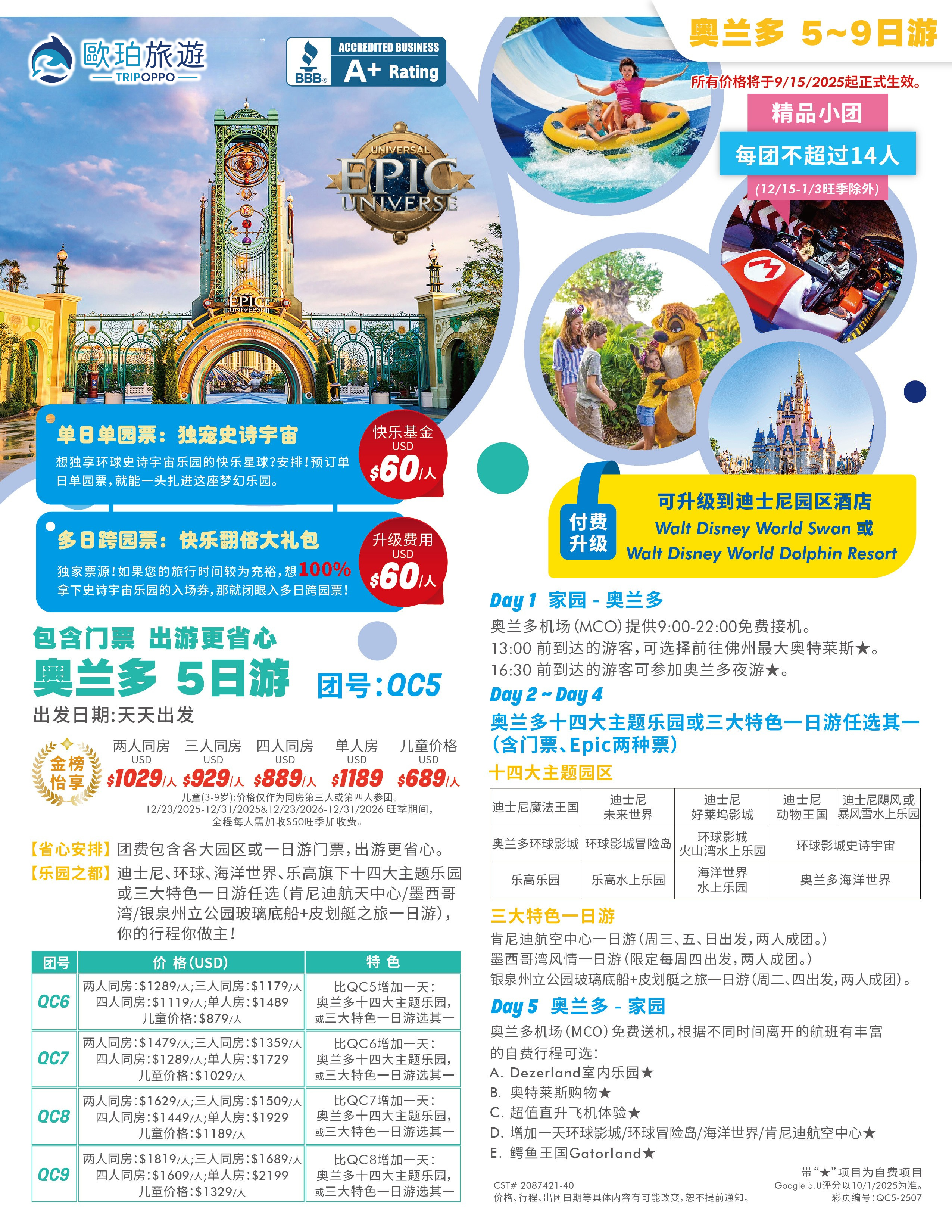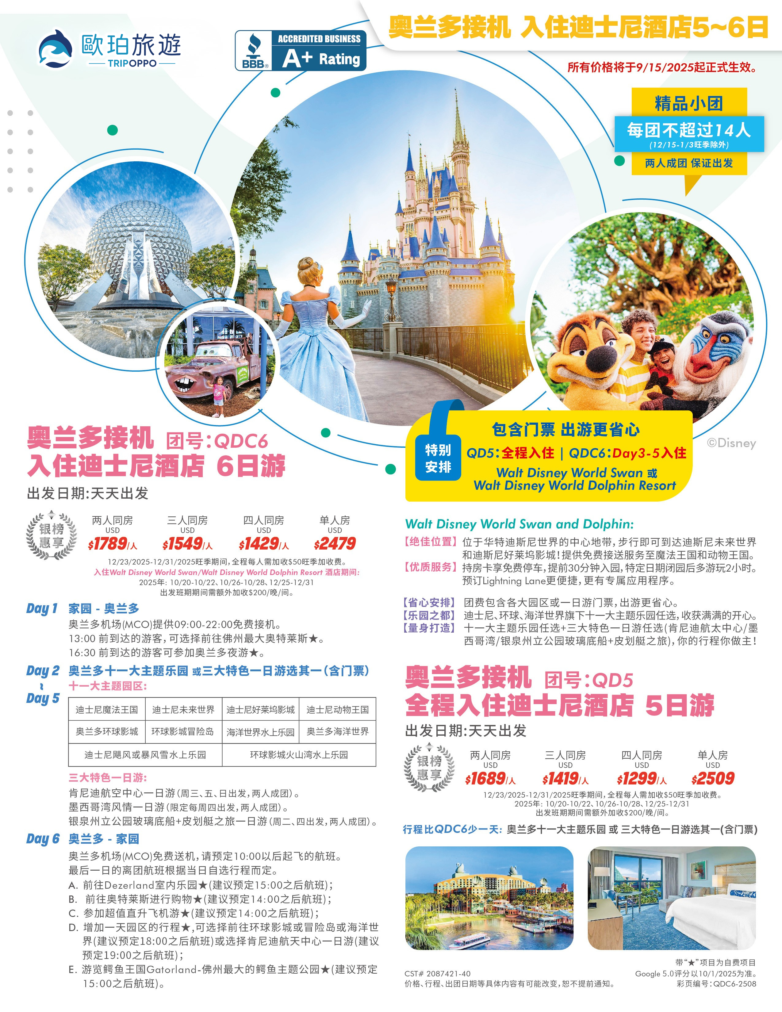 4. 行程中所列主題樂園單日單園門票和特色一日遊費用(奧蘭多接送機/接送站當天所有項目均需自費),說明如下: