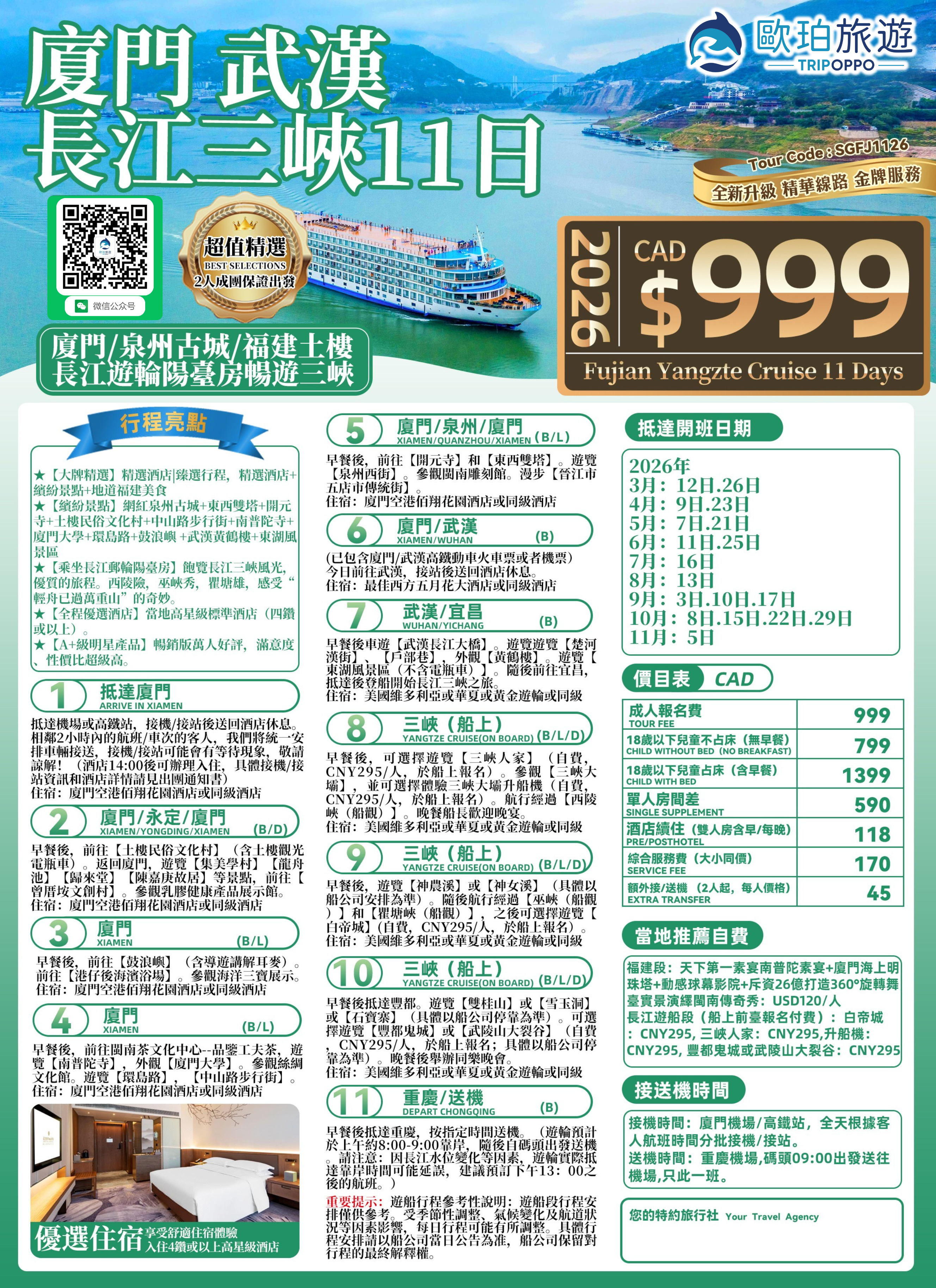 【繽紛景點】網紅泉州古城+東西雙塔+開元寺+土樓民俗文化村+中山路步行街+南普陀寺+廈門大學+環島路+鼓浪嶼 +武漢黃鶴樓+東湖風景區
