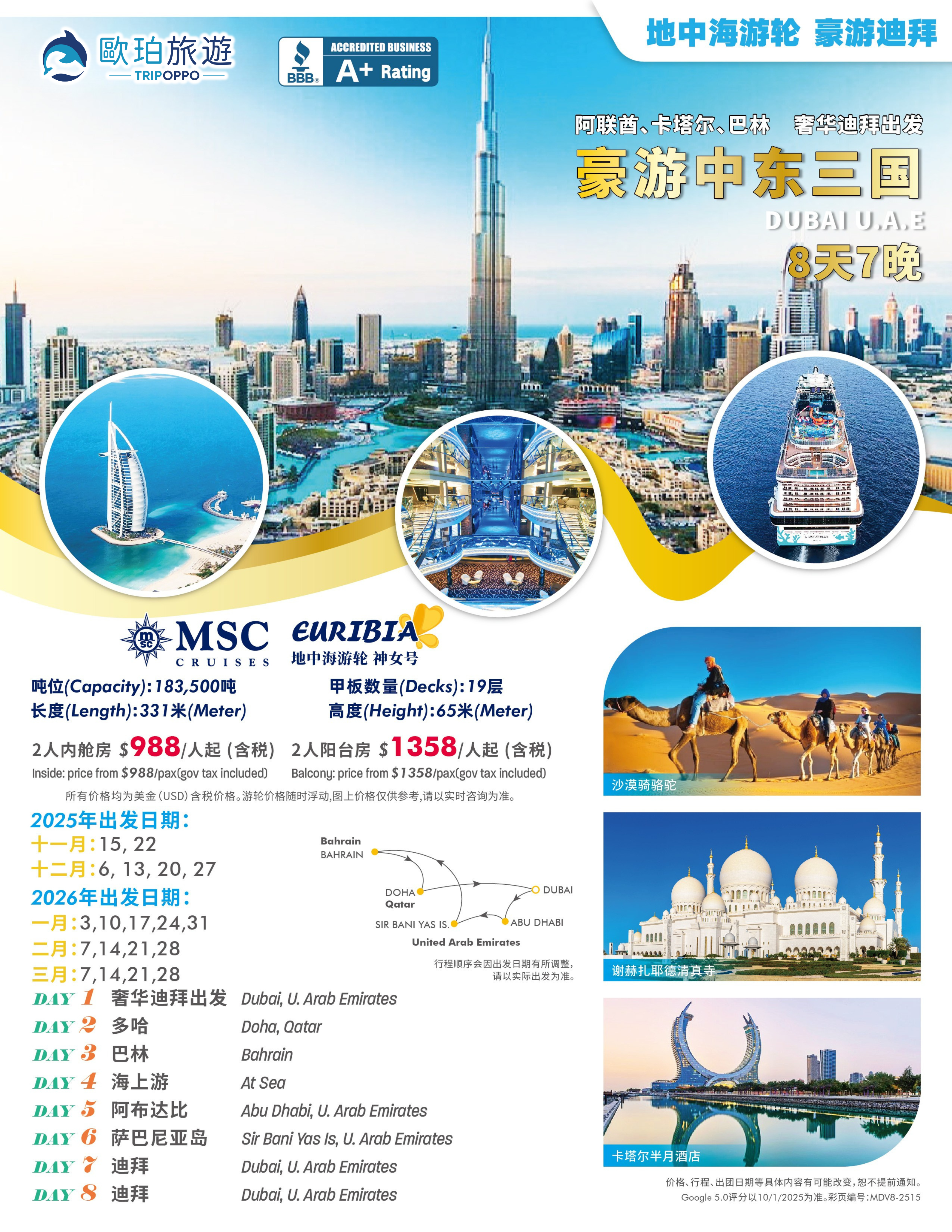豪游迪拜遊輪 MSC EURIBIA 8天