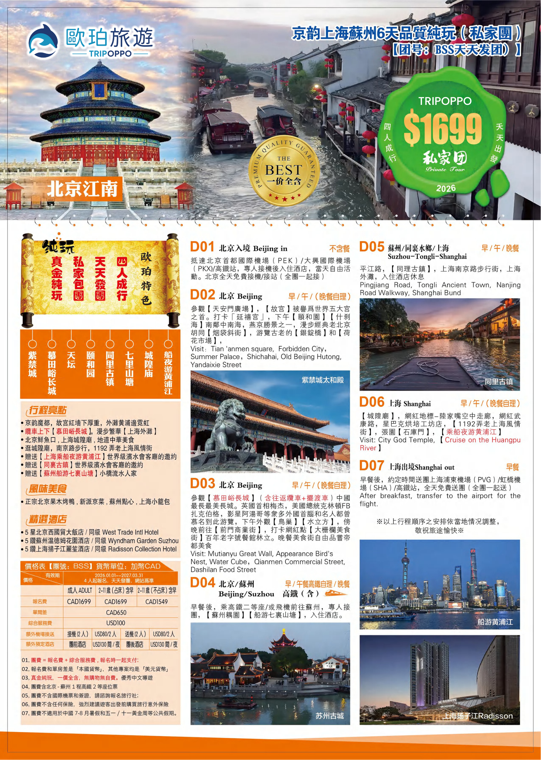 四人成行,天天發團 私家包團,私享服務,不與陌生人拼團遊 真金純玩,無購物無自費【一價全含】 升級中國最美【慕田峪長城】含纜車上下 送上海【搭船夜遊黃浦江】世界級濱水會客廳的邀約