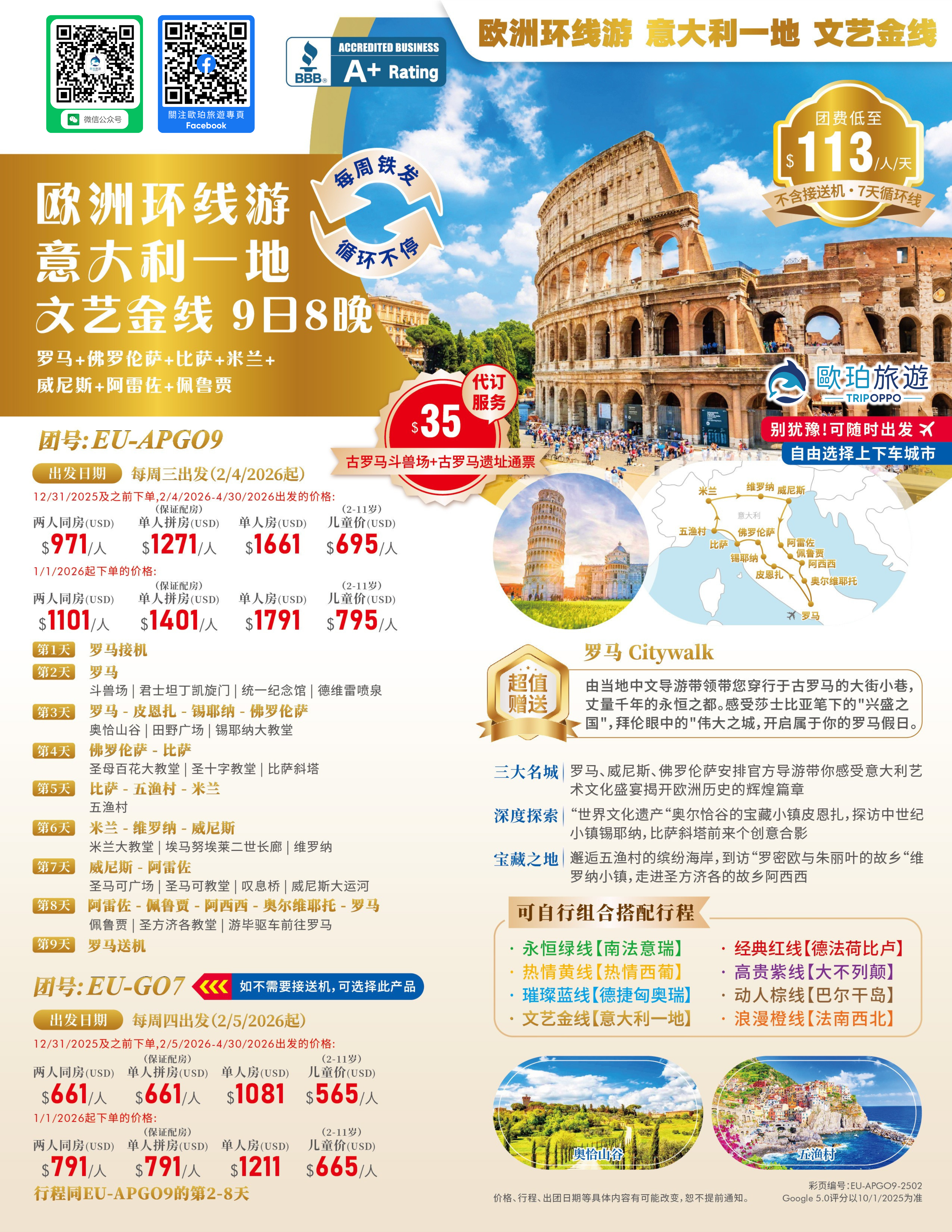 重磅安排官導帶遊羅馬、威尼斯、佛羅倫薩三大經典城市,帶你感受義大利藝術文化盛宴,揭開歐洲歷史的輝煌篇章。