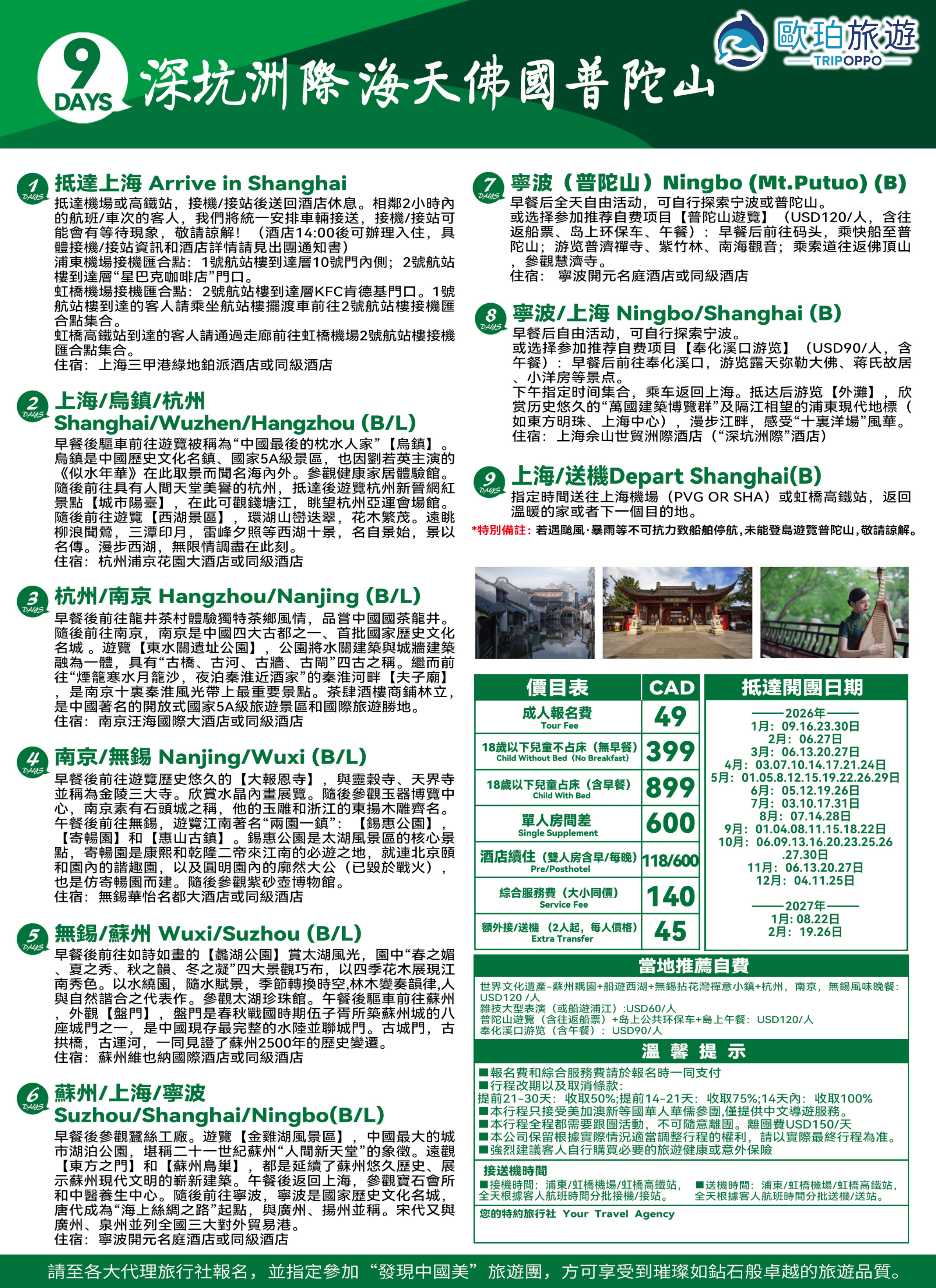 【優選行程】:海天佛國普陀山,烏鎮東柵景區,西湖景區,夫子廟,大報恩寺遺址公園,錫惠公園,寄暢園,惠山古鎮,太湖風景區,,金雞湖風景區,上海灘:各有各的歷史,各有各的風情。