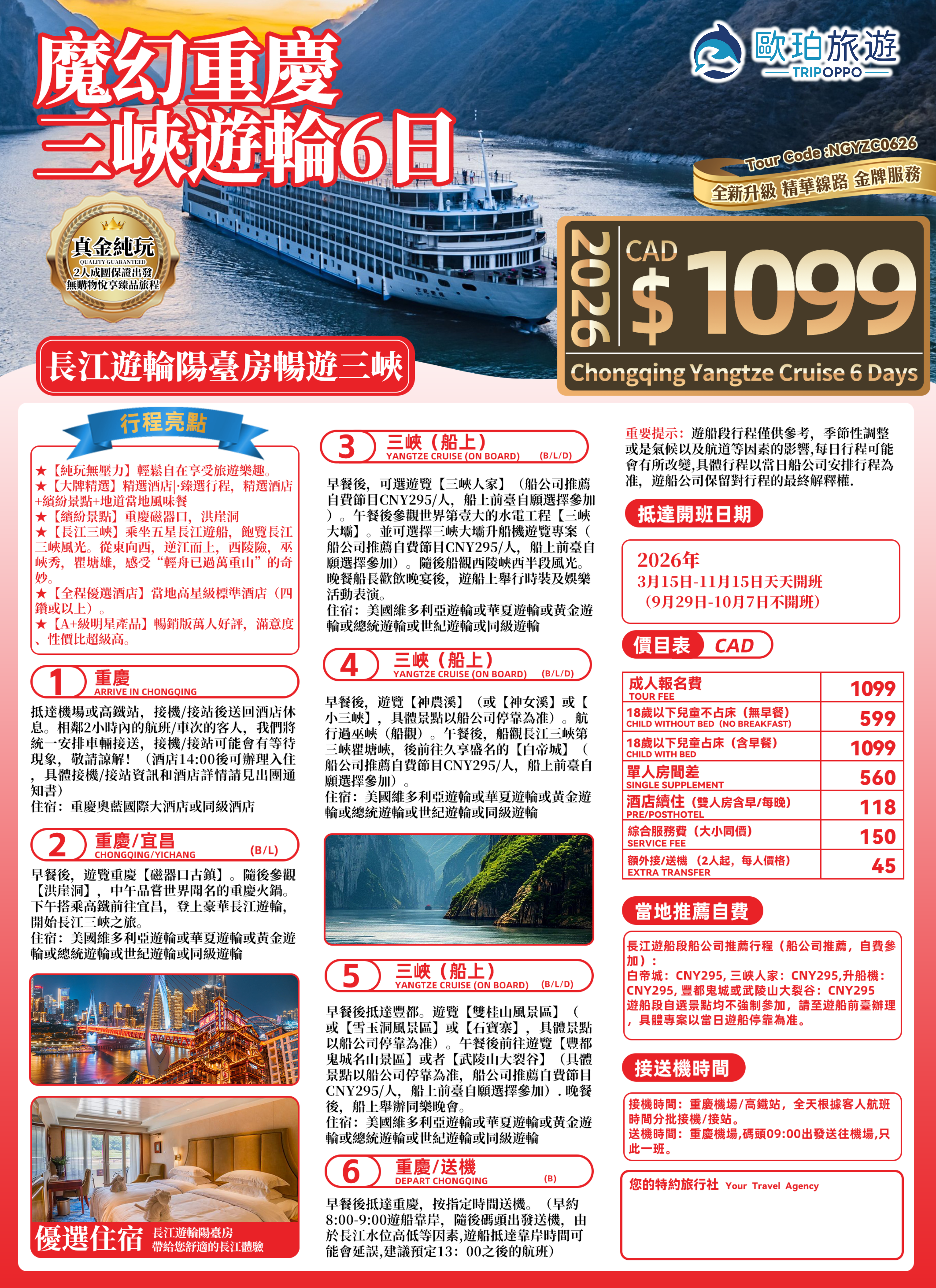【繽紛景點】乘坐豪華五星長江遊船,飽覽長江三峽風光,優質的旅程。從東向西,逆江而上,西陵險,巫峽秀,瞿塘雄,感受“輕舟已過萬重山”的奇妙。重庆磁器口,洪崖洞
