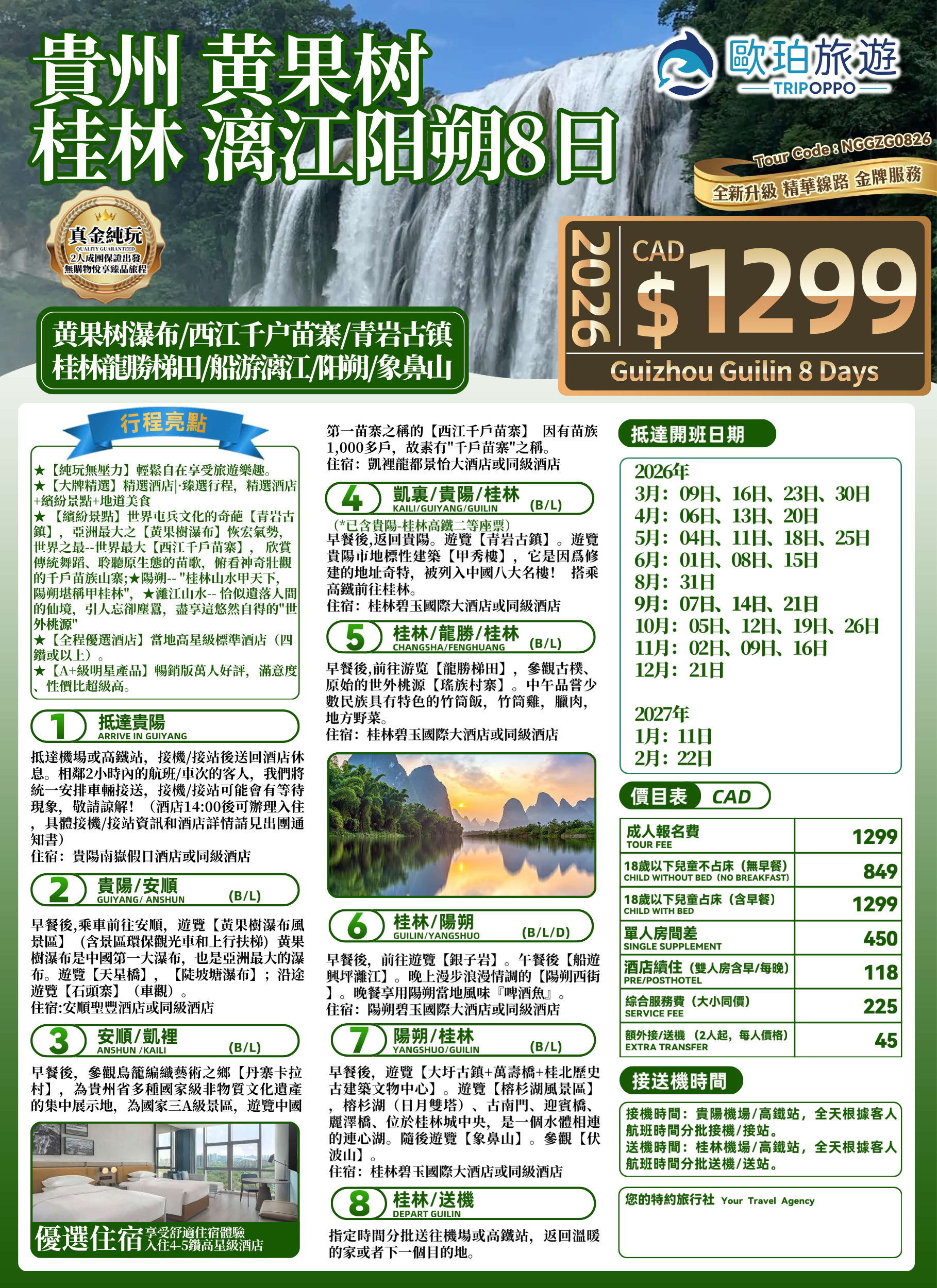 ★ 【繽紛景點】世界屯兵文化的奇葩【青岩古鎮】,亞洲最大之【黃果樹瀑布】恢宏氣勢,世界之最--世界最大【西江千戶苗寨】, 欣賞傳統舞蹈、聆聽原生態的苗歌,俯看神奇壯觀的千戶苗族山寨;★陽朔-- "桂林山水甲天下,陽朔堪稱甲桂林",★灕江山水-- 恰似遺落人間的仙境,引人忘卻塵囂,盡享這悠然自得的"世外桃源"