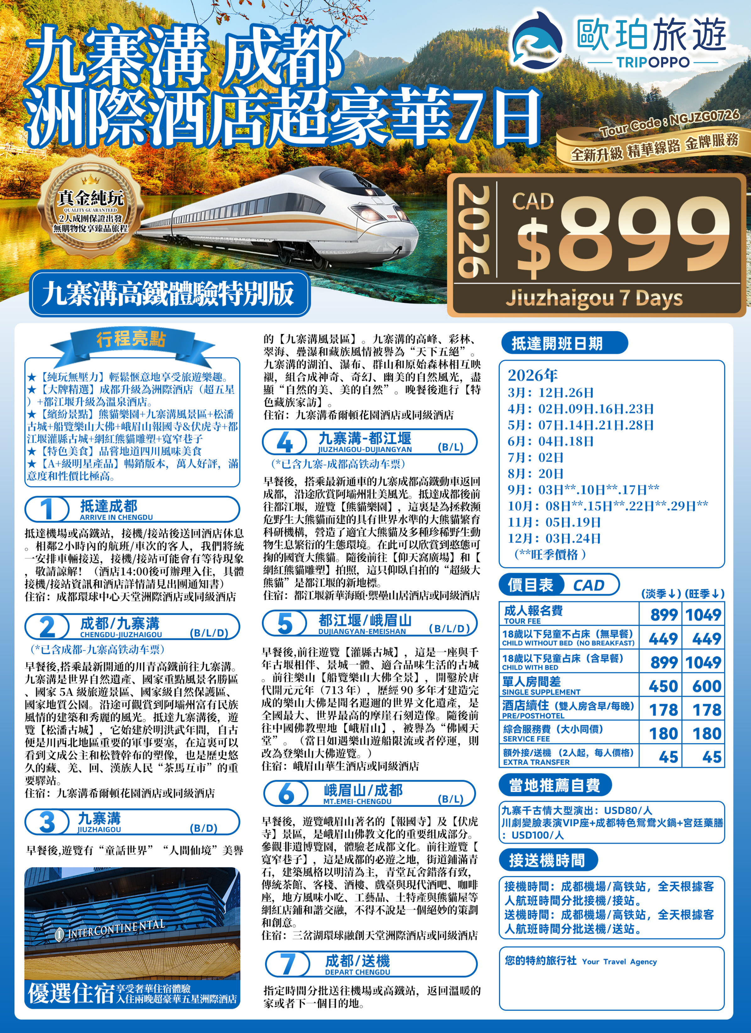 【繽紛景點】熊貓樂園+九寨溝風景區+松潘古城+船覽樂山大佛全景+峨眉山報國寺&伏虎寺+都江堰灌縣古城+寬窄巷子+黄龙风景区(自费)