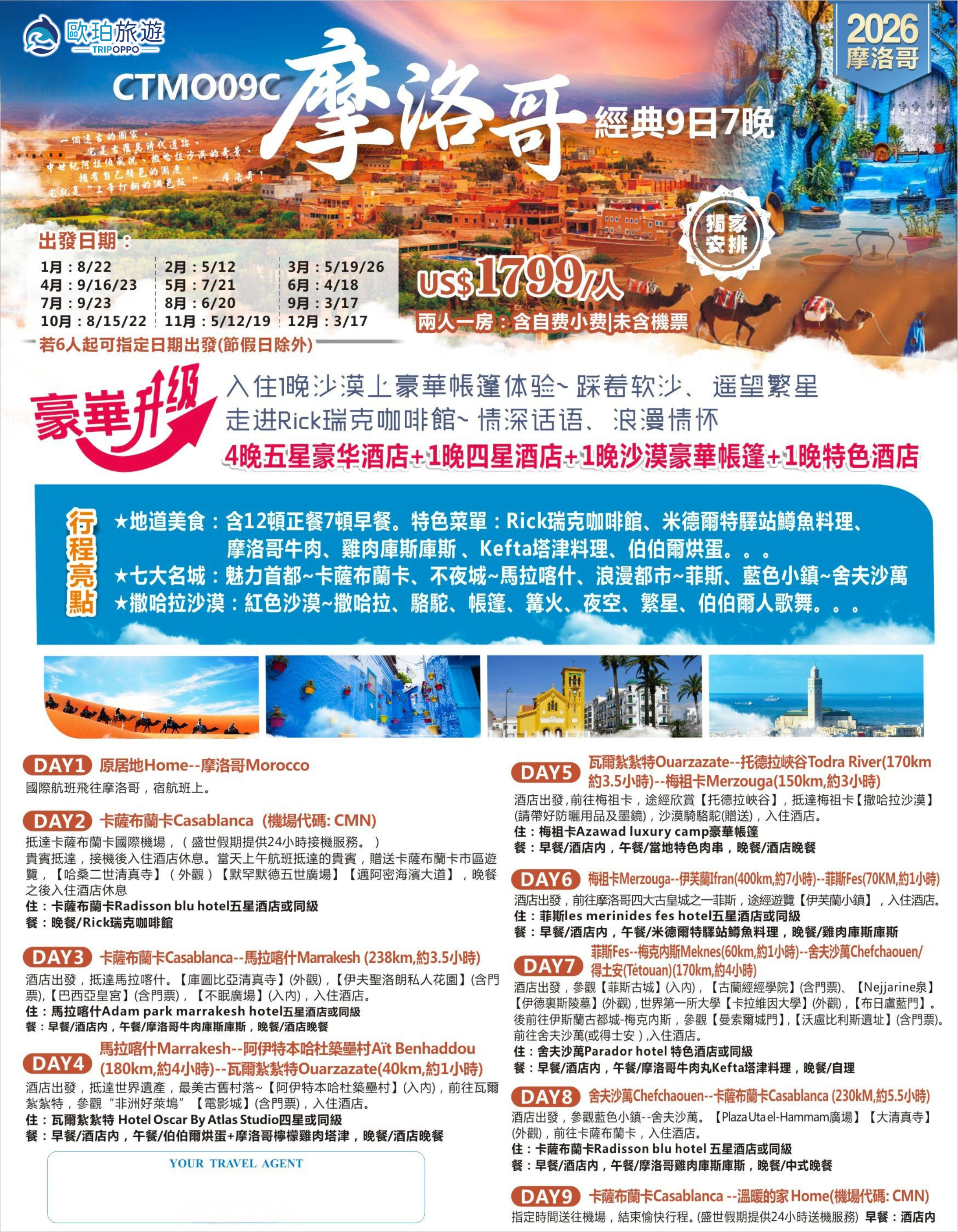 ★豪華住宿:4晚五星豪华酒店+1晚四星酒店+1晚沙漠豪華帳篷+1晚特色酒店