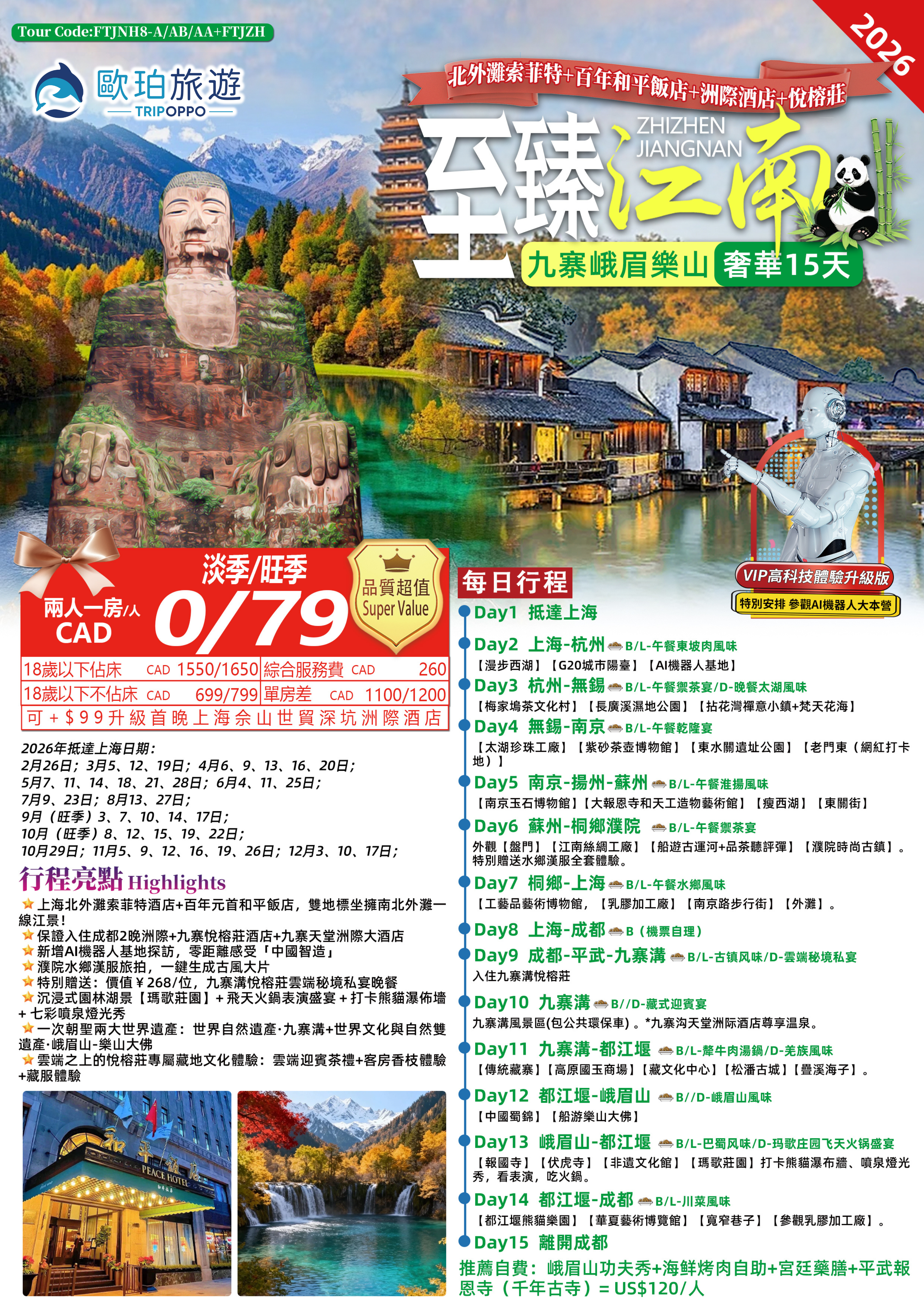 超值 至臻江南・九寨峨眉樂山奢華15天