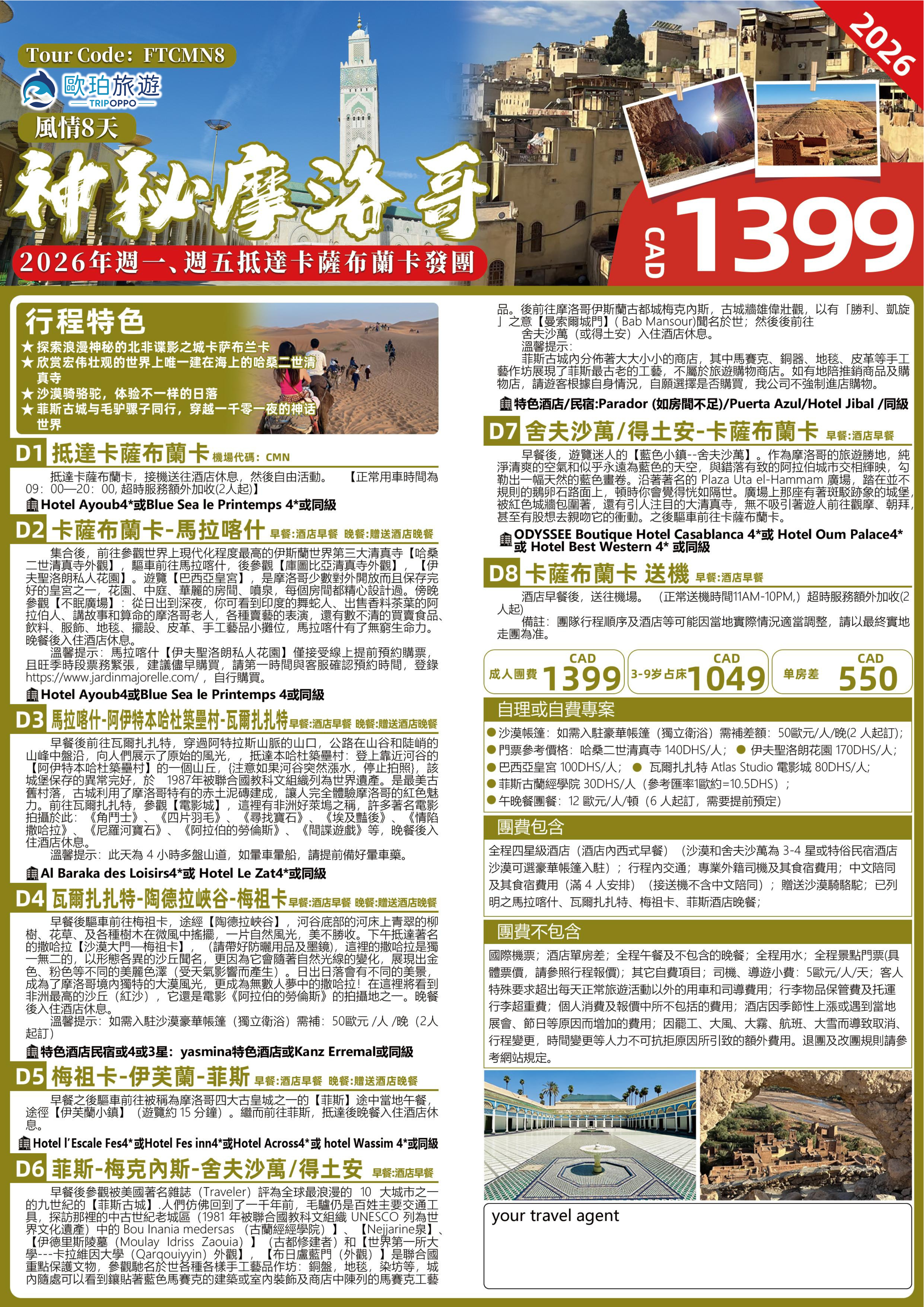 司机、导游小费:5 欧元/人/天;(迪拉姆 美元 欧元 英镑等值货币均可)请在当地支付即可