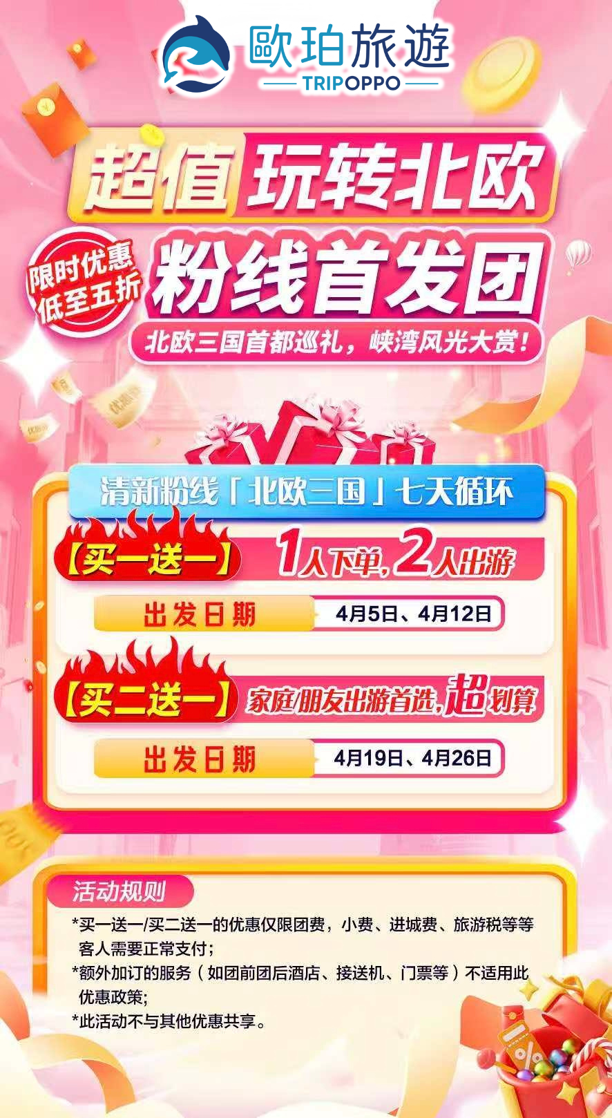 *北歐粉線因其當地的酒店成本昂貴,需加收$110/人住宿附加費。