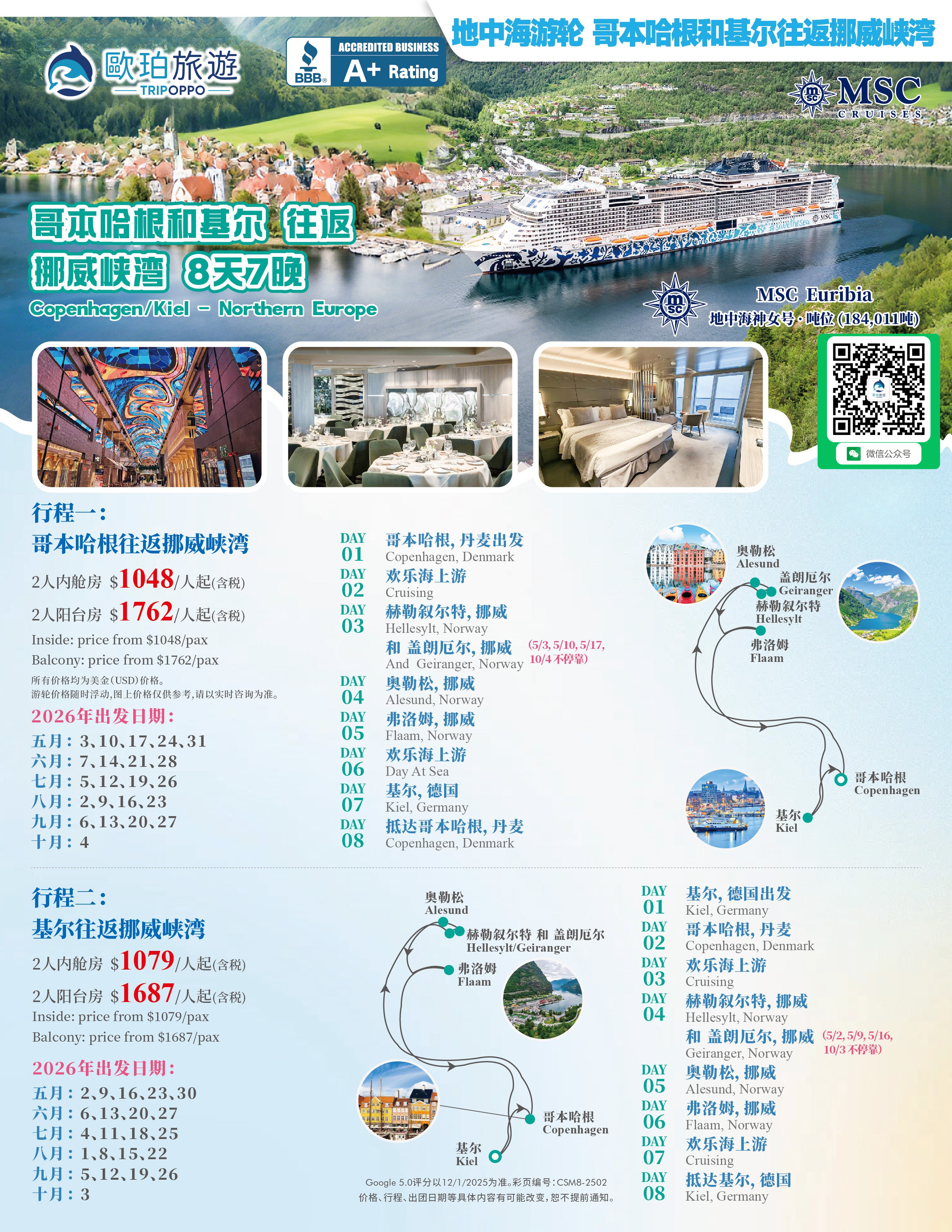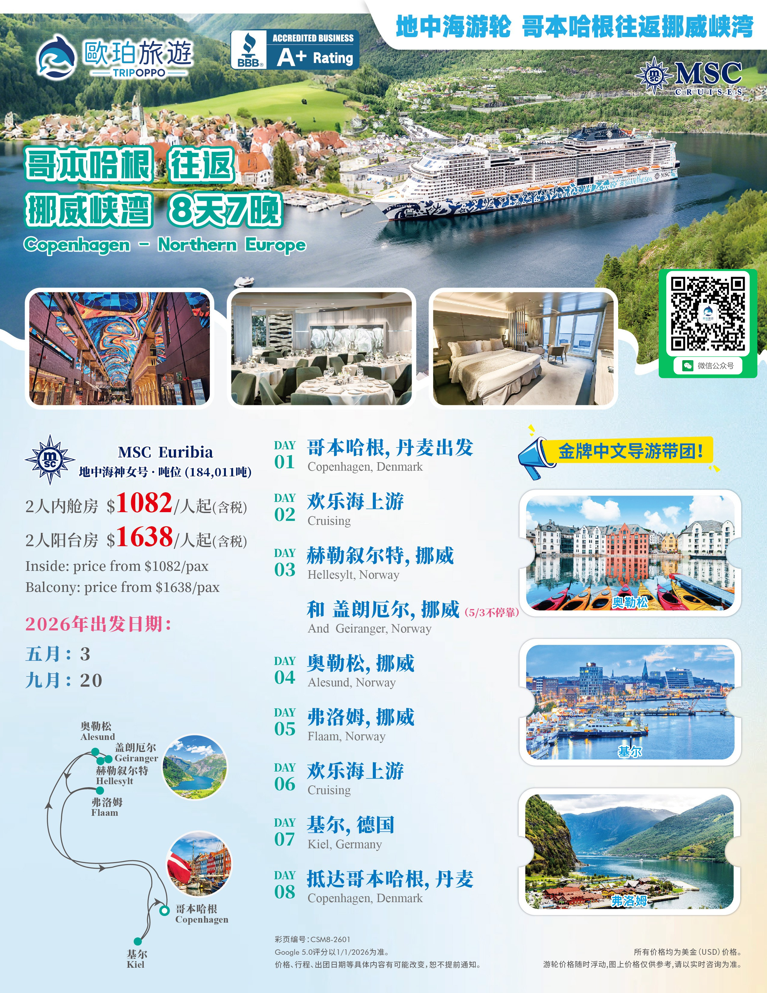 歐洲 北歐挪威峽灣游輪 MSC EURIBIA 8天