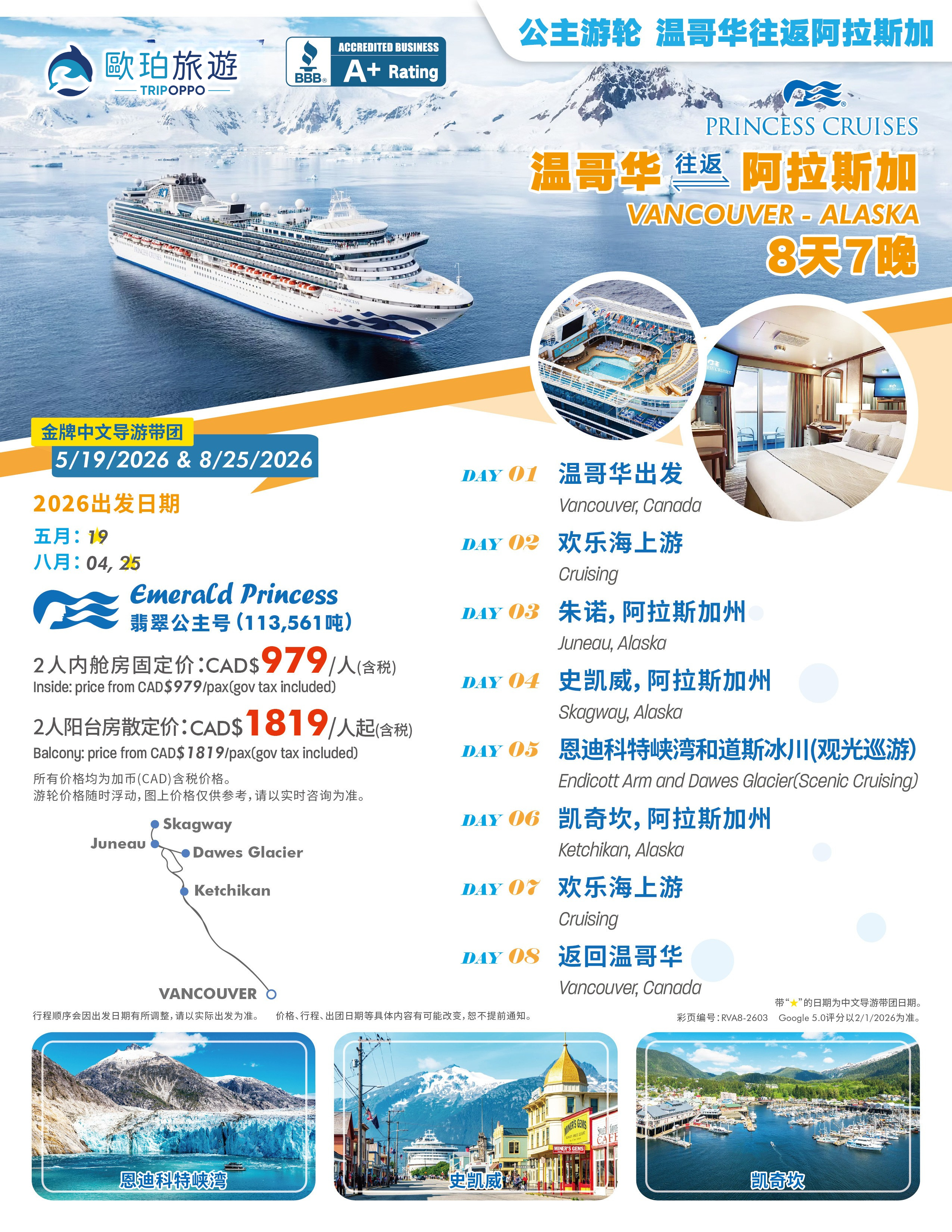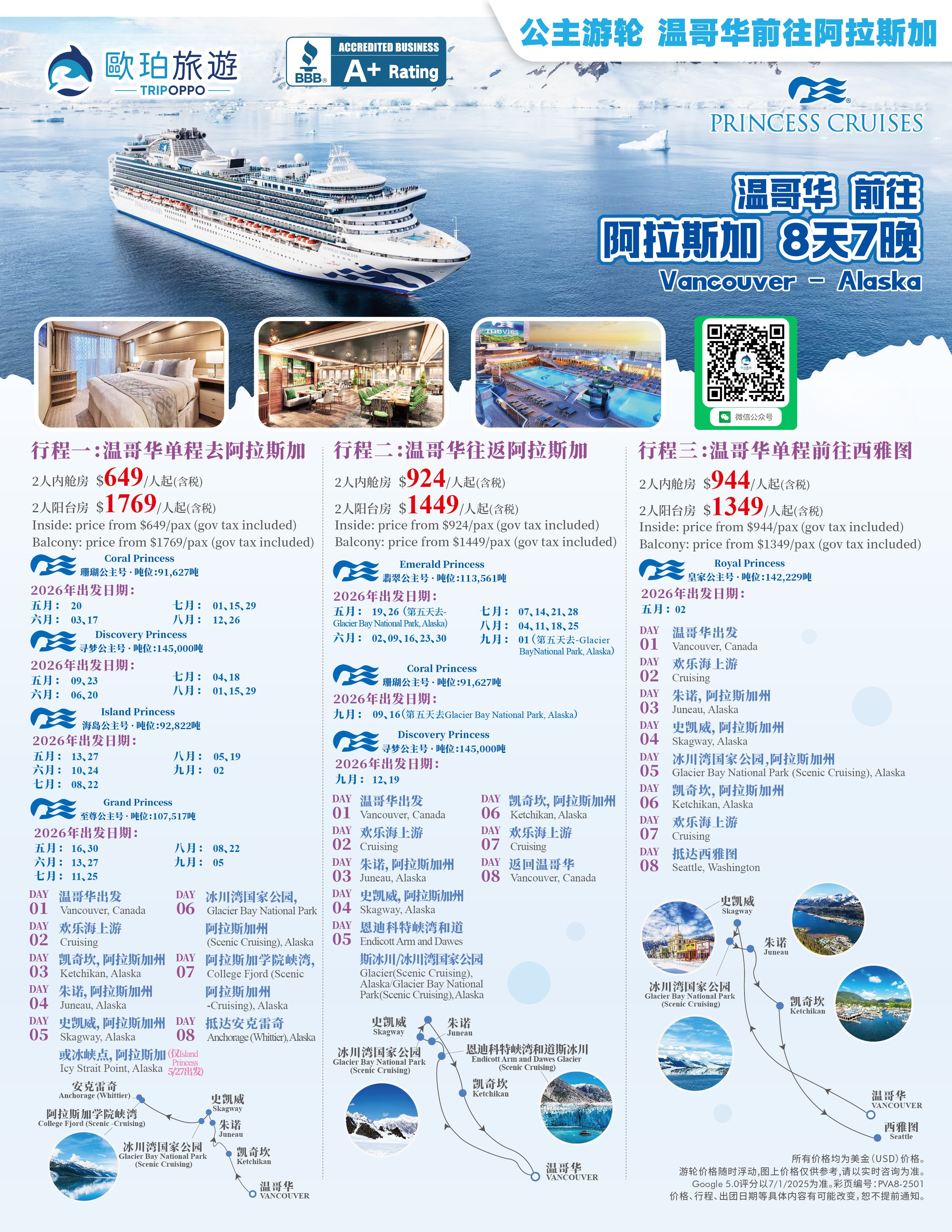 北美 溫哥華往返 阿拉斯加 公主郵輪8天