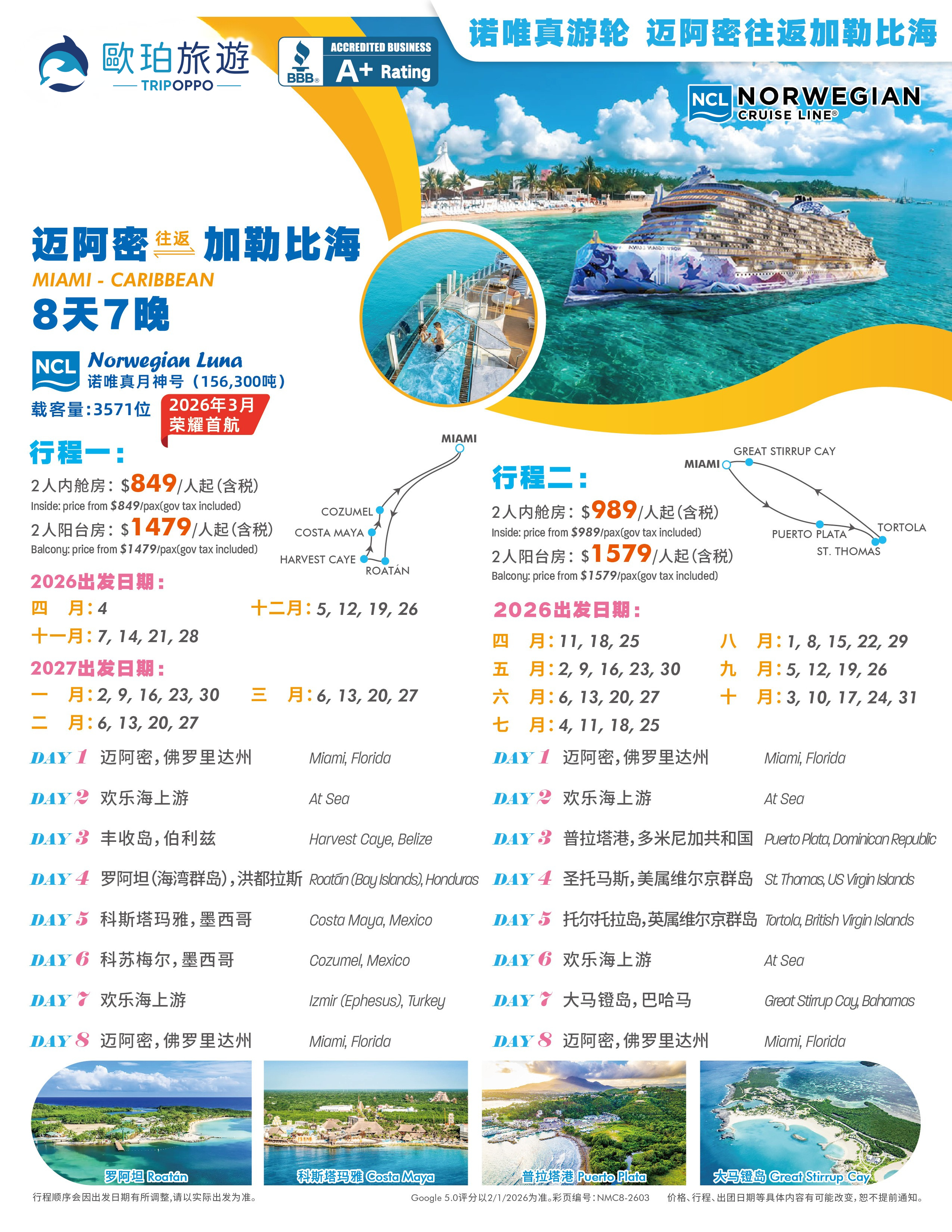 2026 首航 诺唯真月神号 NCL LUNA 迈阿密往返加勒比海