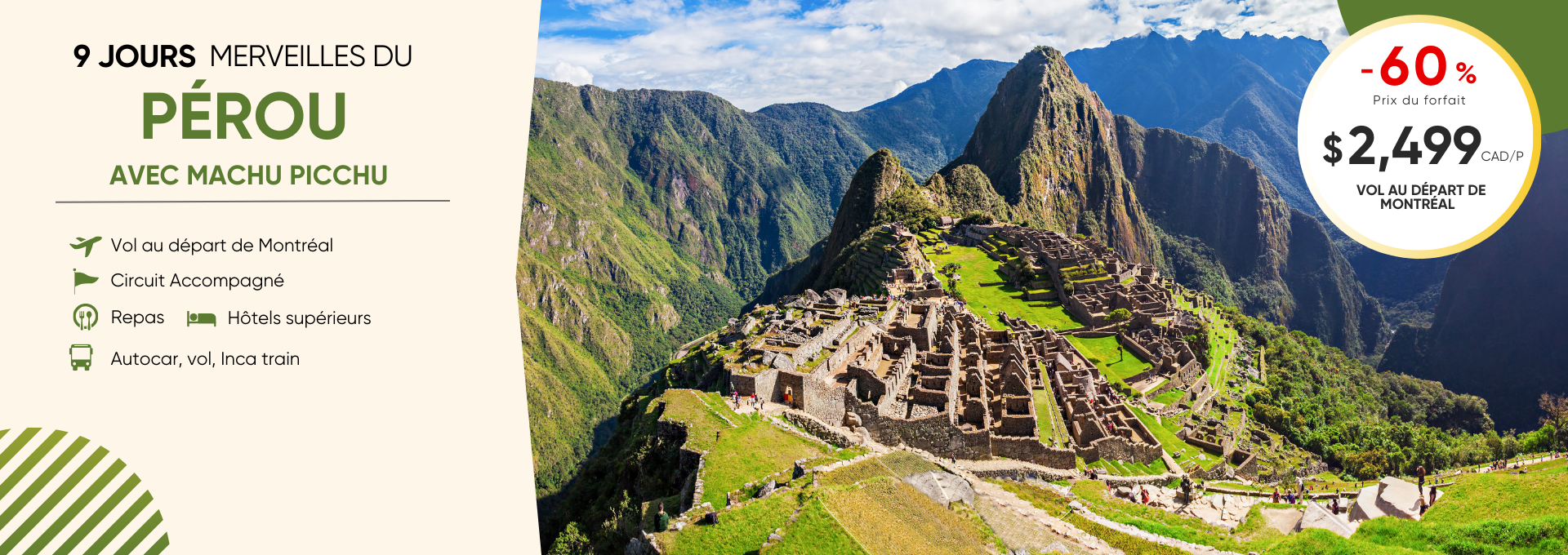 Saisissez cette offre incroyable : une visite guidée de 7 nuits et 9 jours à travers les merveilles les plus impressionnantes du Pérou, à partir de seulement 2 299 $ ! Les places sont limitées, premier arrivé, premier servi !