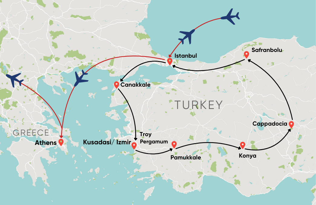 Ancient Greece and Roman Byzantine collided in modern day Turkey, the two great empires leaving behind mesmerizing odes to the earliest Western Civilizations. Ancient cities like Ephesus and Troy vividly unveil a Greco Roman affair. In Istanbul and Athens the heartbeats of two empires stand still, reflected in marbled pillars and resplendent domes that cascade from afar. On this fabulous tour through Turkey and Greece you will find engrossing history and majestic beaches, treasured ruins and breathtaking landscapes. From large cities to charming villages, you will find the remnants of myths, beautiful scenery, and remarkable culture.